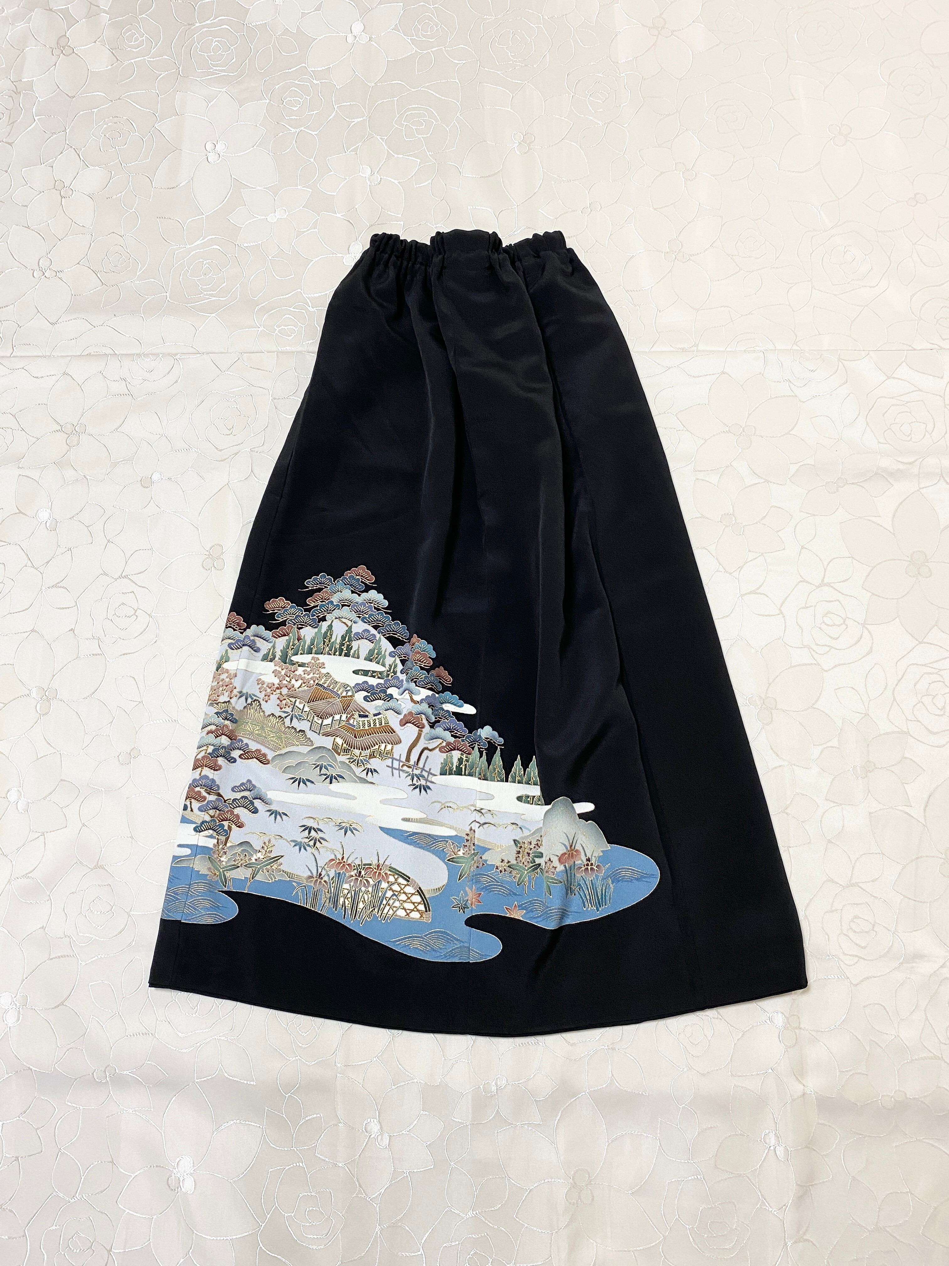 黒留袖着物リメイクウエストゴムロングスカート送料無料フリーサイズ1点物黒留袖着物リメイクウエストゴムロングスカートハンドメイド黒留袖着物リメイクロングスカート1点物NO.1054