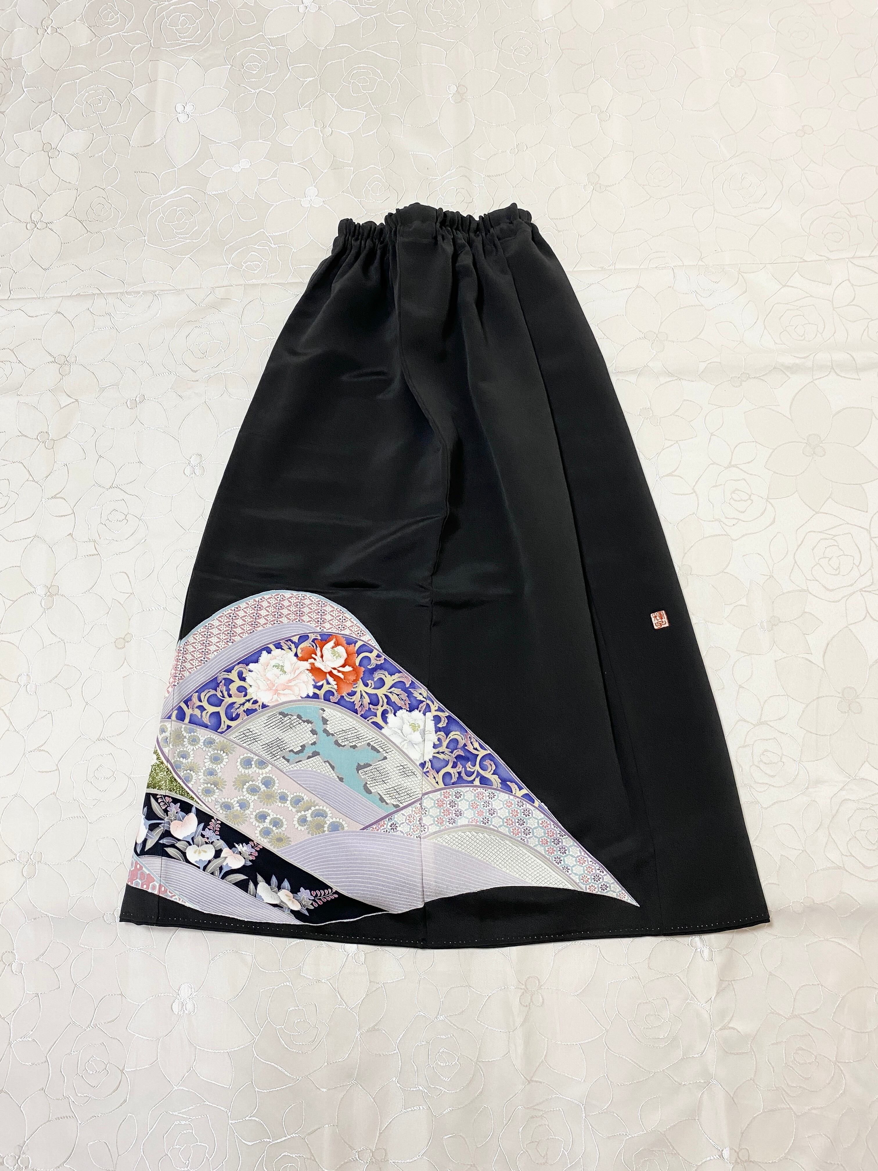 黒留袖着物をリメイクして作製したウエストゴムロングドレススカートフリーサイズ【超ロング丈】です。
