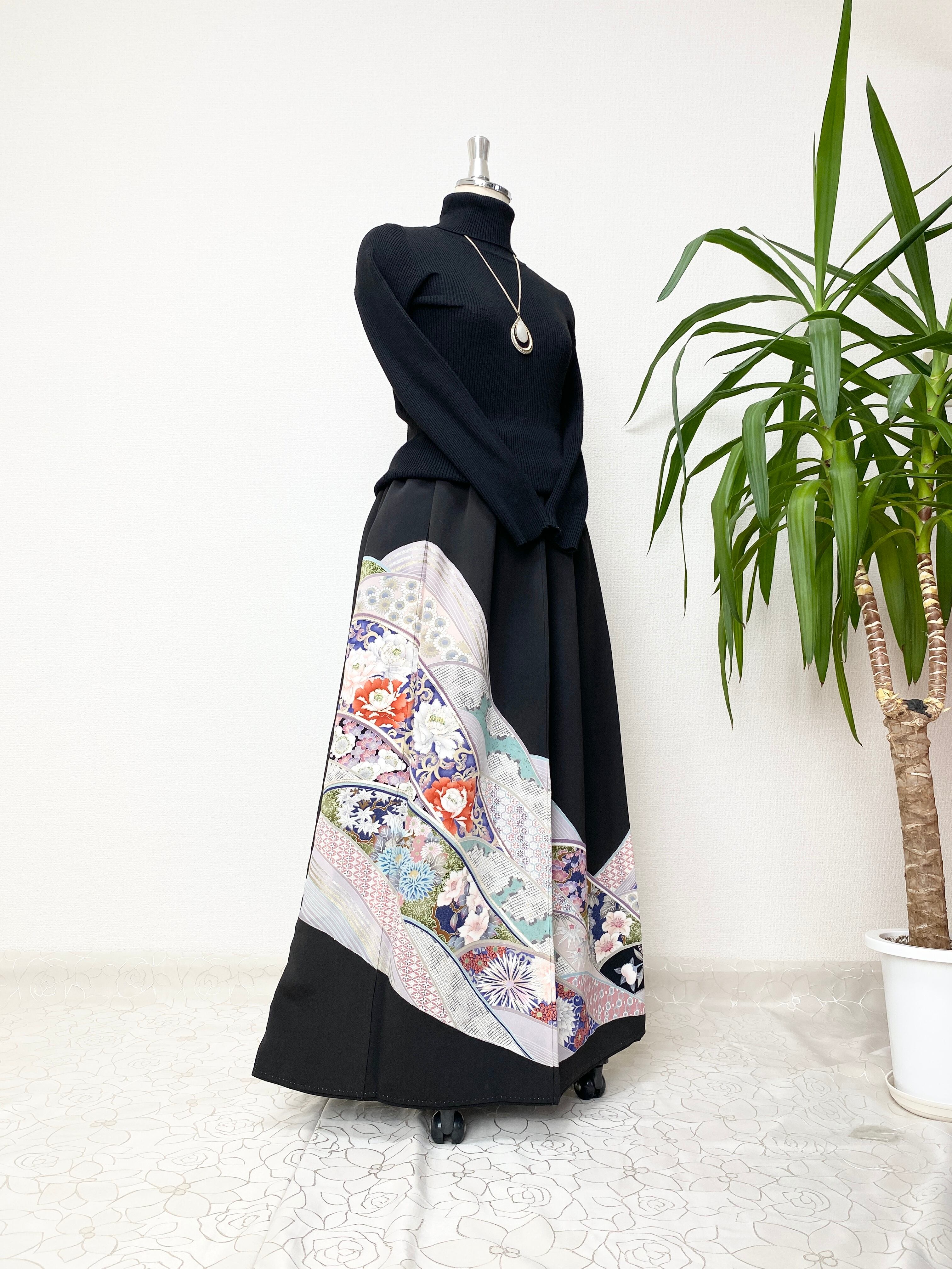 黒留袖着物リメイクウエストゴムロングドレススカートフリーサイズ【超ロング丈】