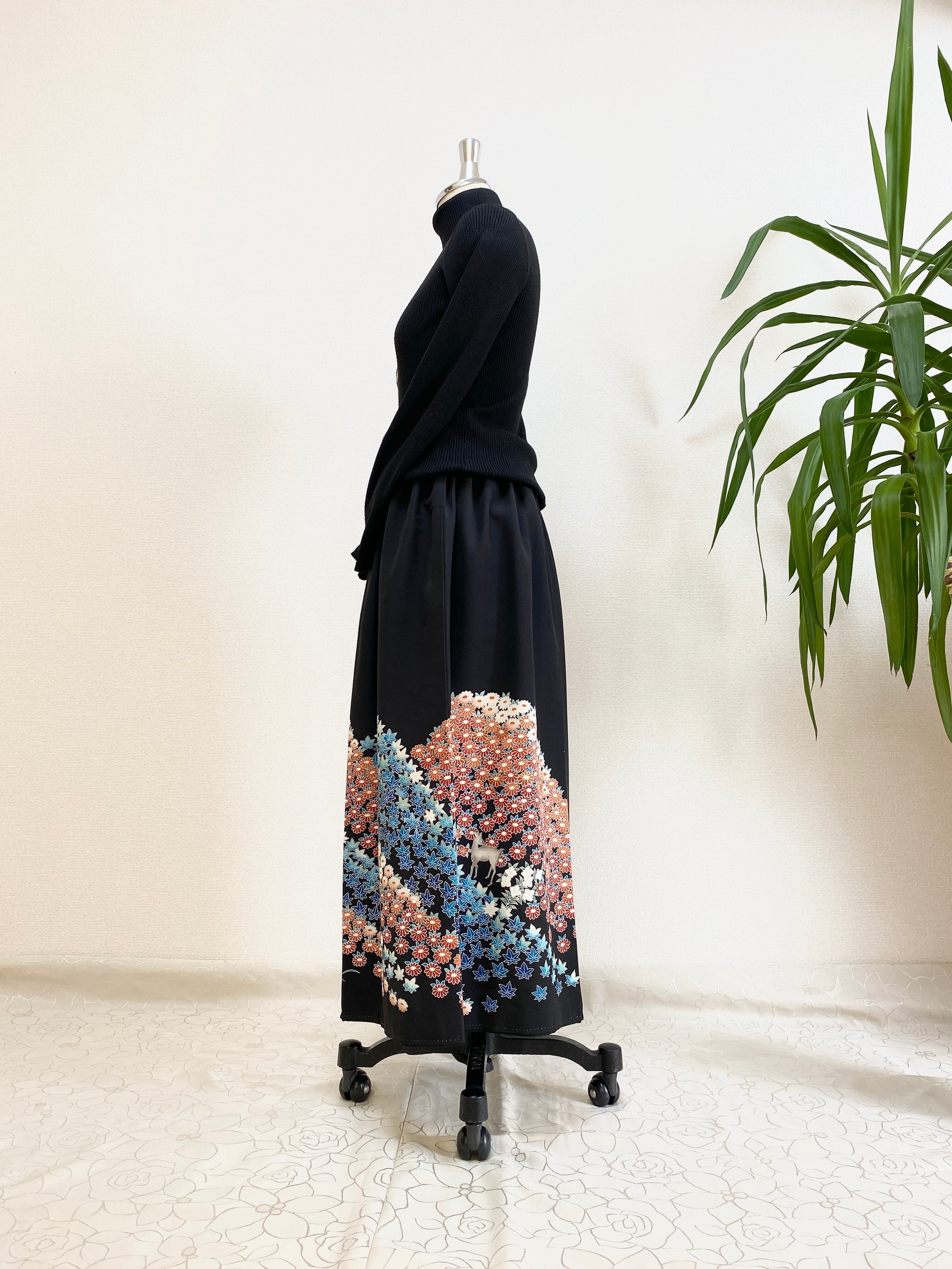 黒留袖着物リメイクウエストゴムロングスカート送料無料フリーサイズ1点物黒留袖着物リメイクウエストゴムロングスカートハンドメイド黒留袖着物リメイクロングスカート1点物NO.1076