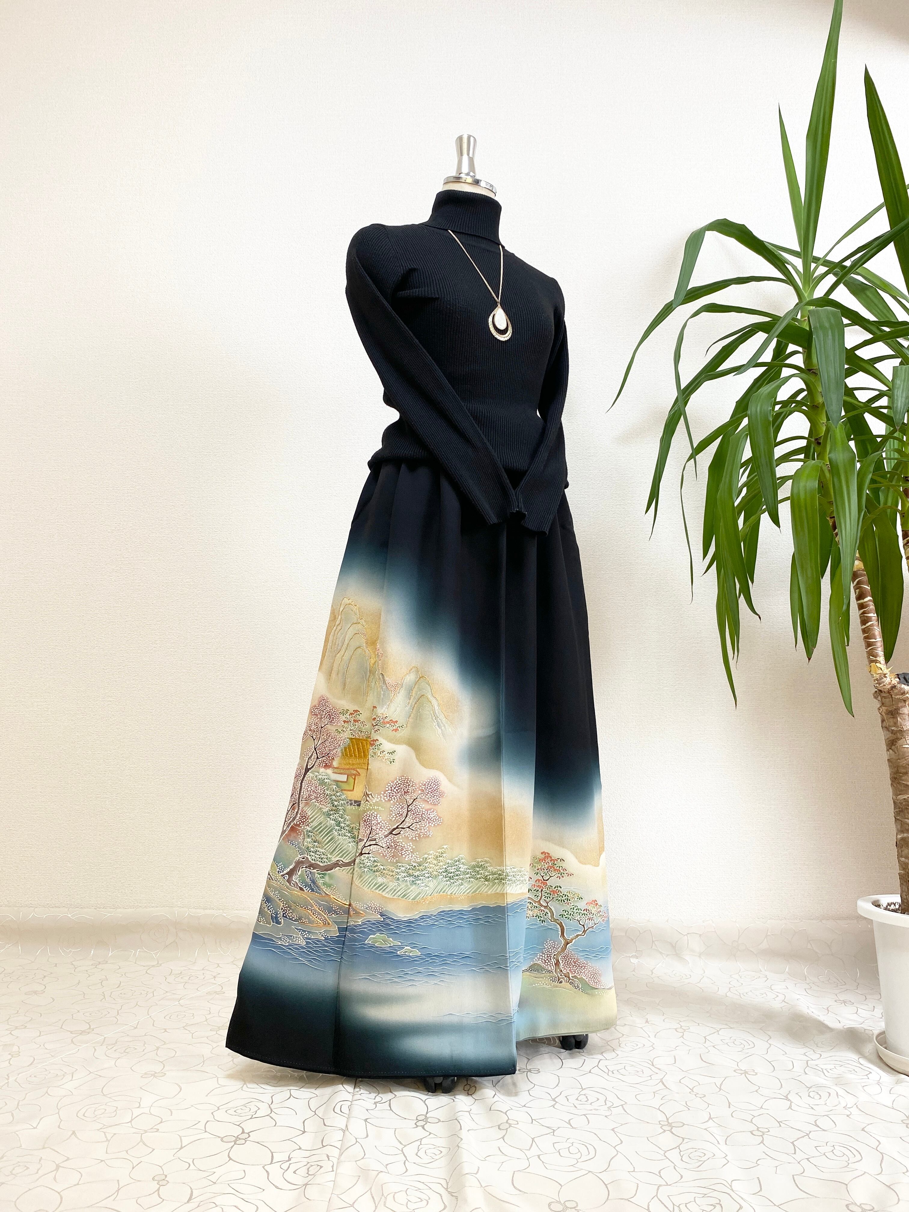 黒留袖着物リメイクウエストゴムロングドレススカートフリーサイズ【超ロング丈】