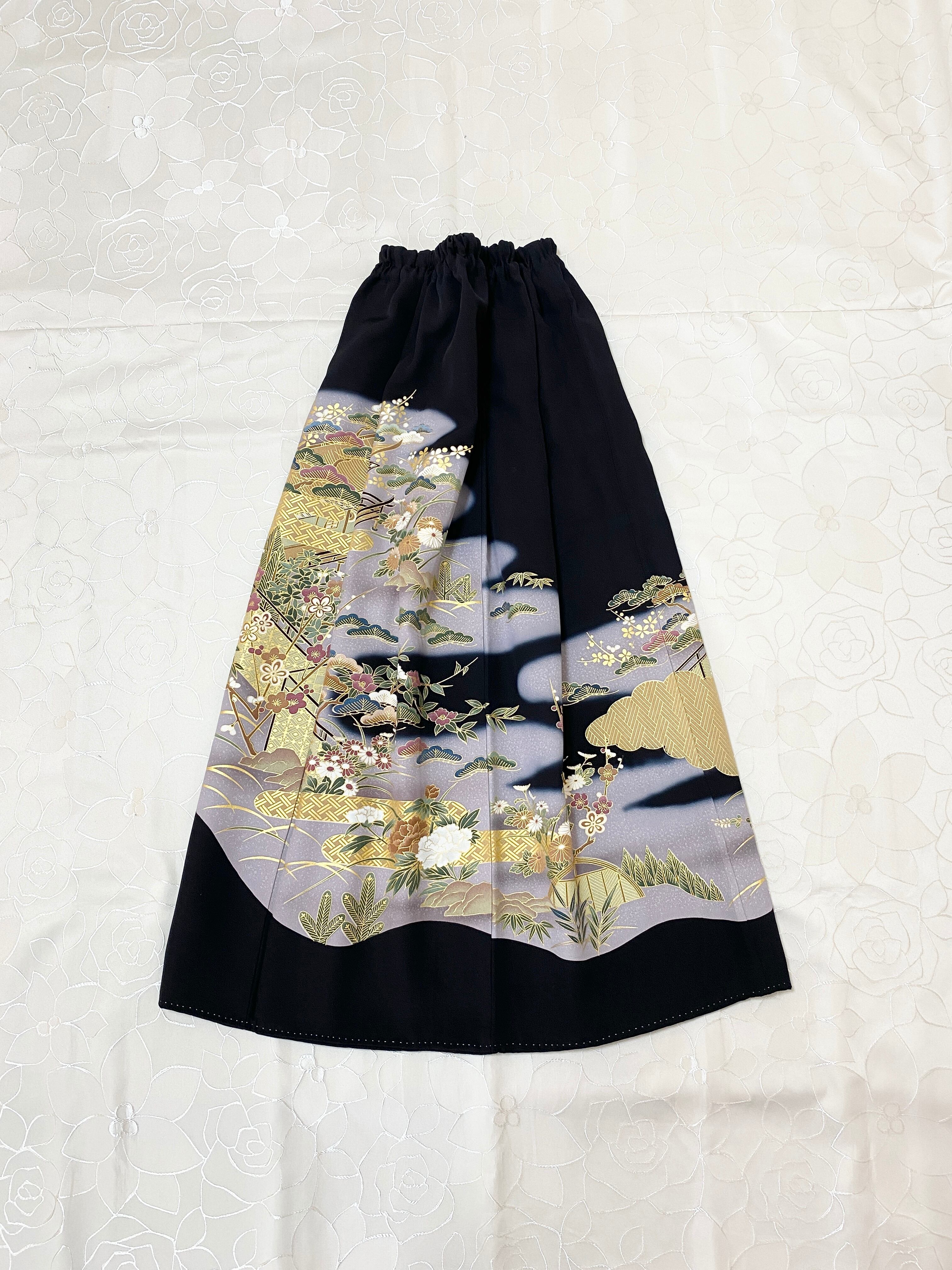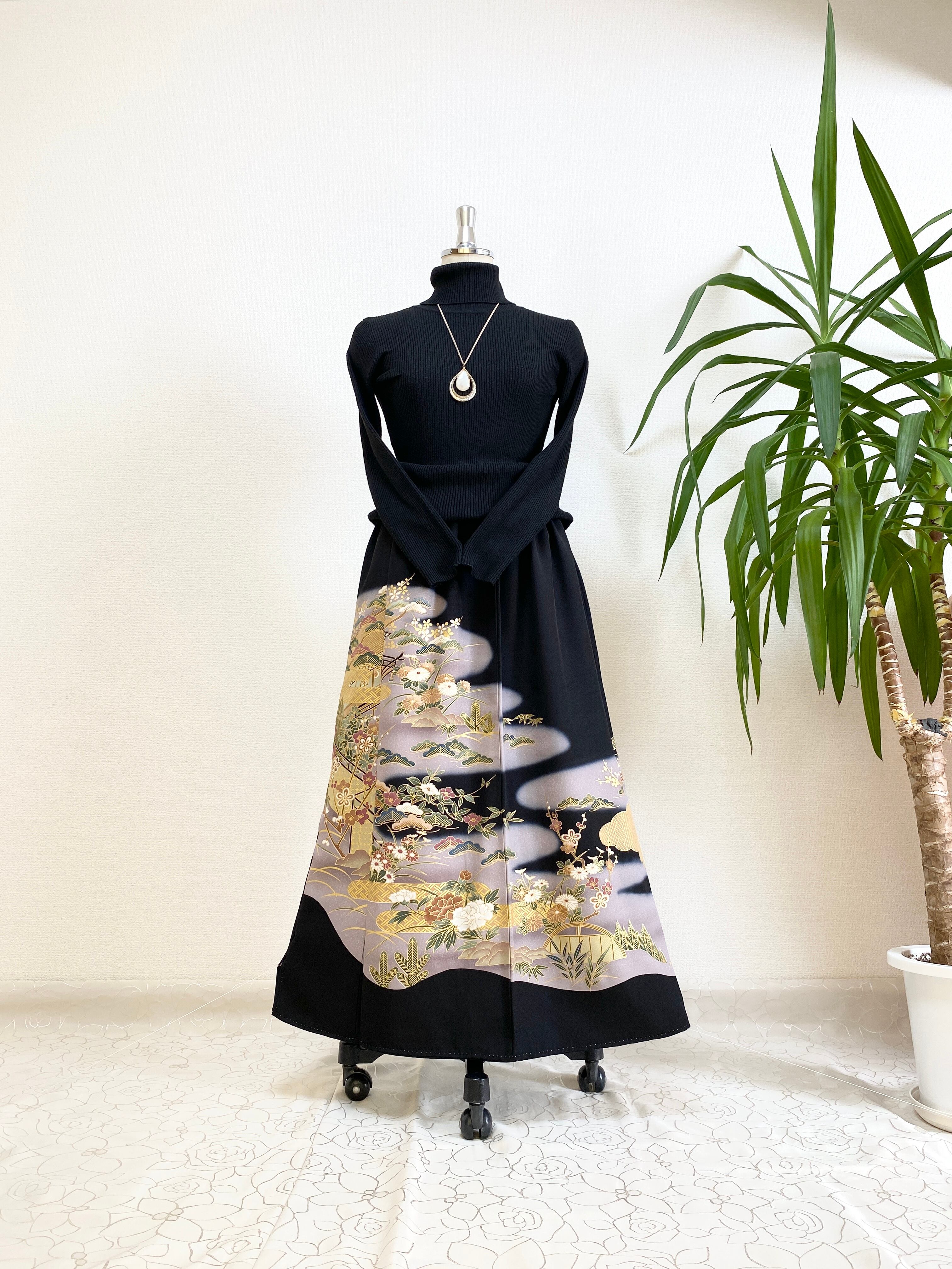 黒留袖着物リメイクウエストゴムロングスカート送料無料フリーサイズ1点物黒留袖着物リメイクウエストゴムロングスカートハンドメイド黒留袖着物リメイクロングスカート1点物NO.1094