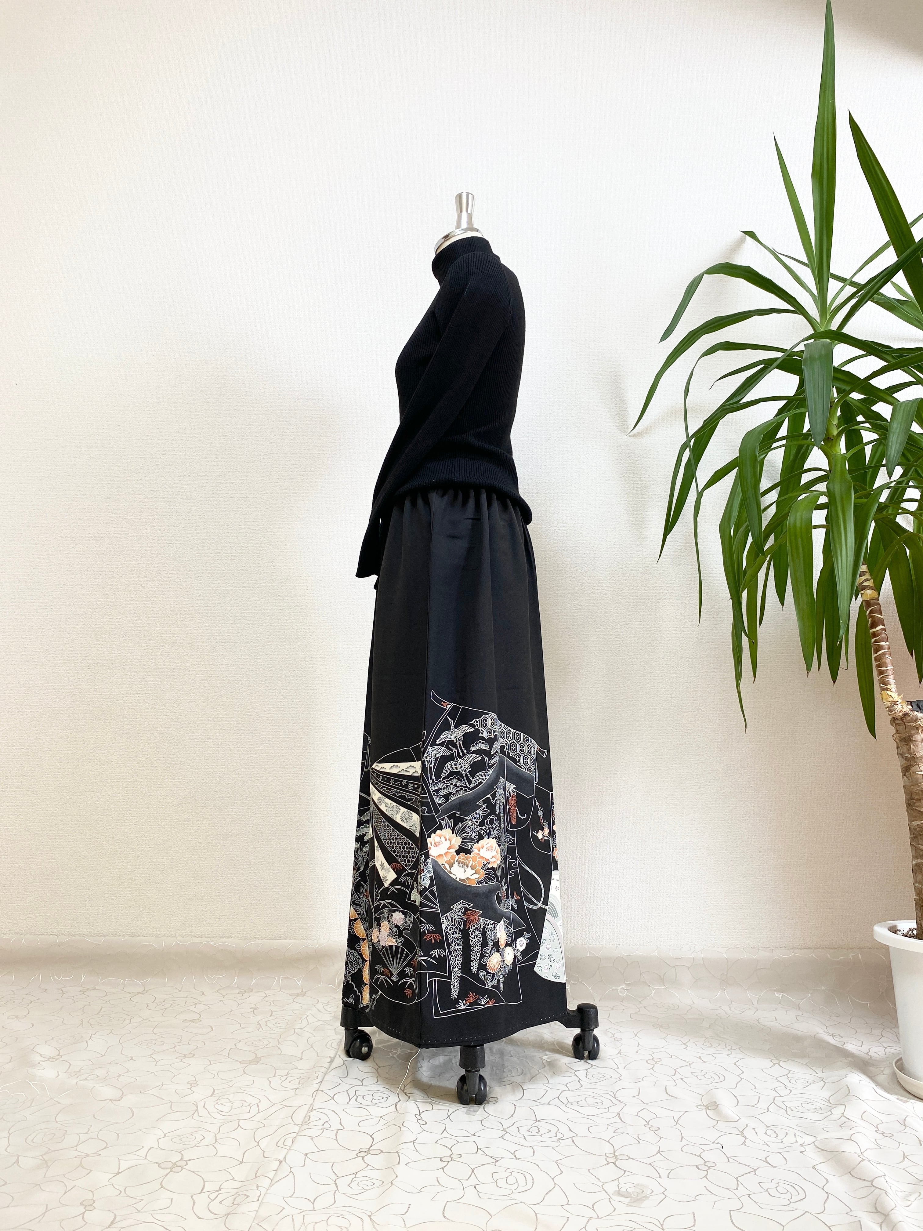 黒留袖着物リメイクウエストゴムロングスカートフリーサイズ