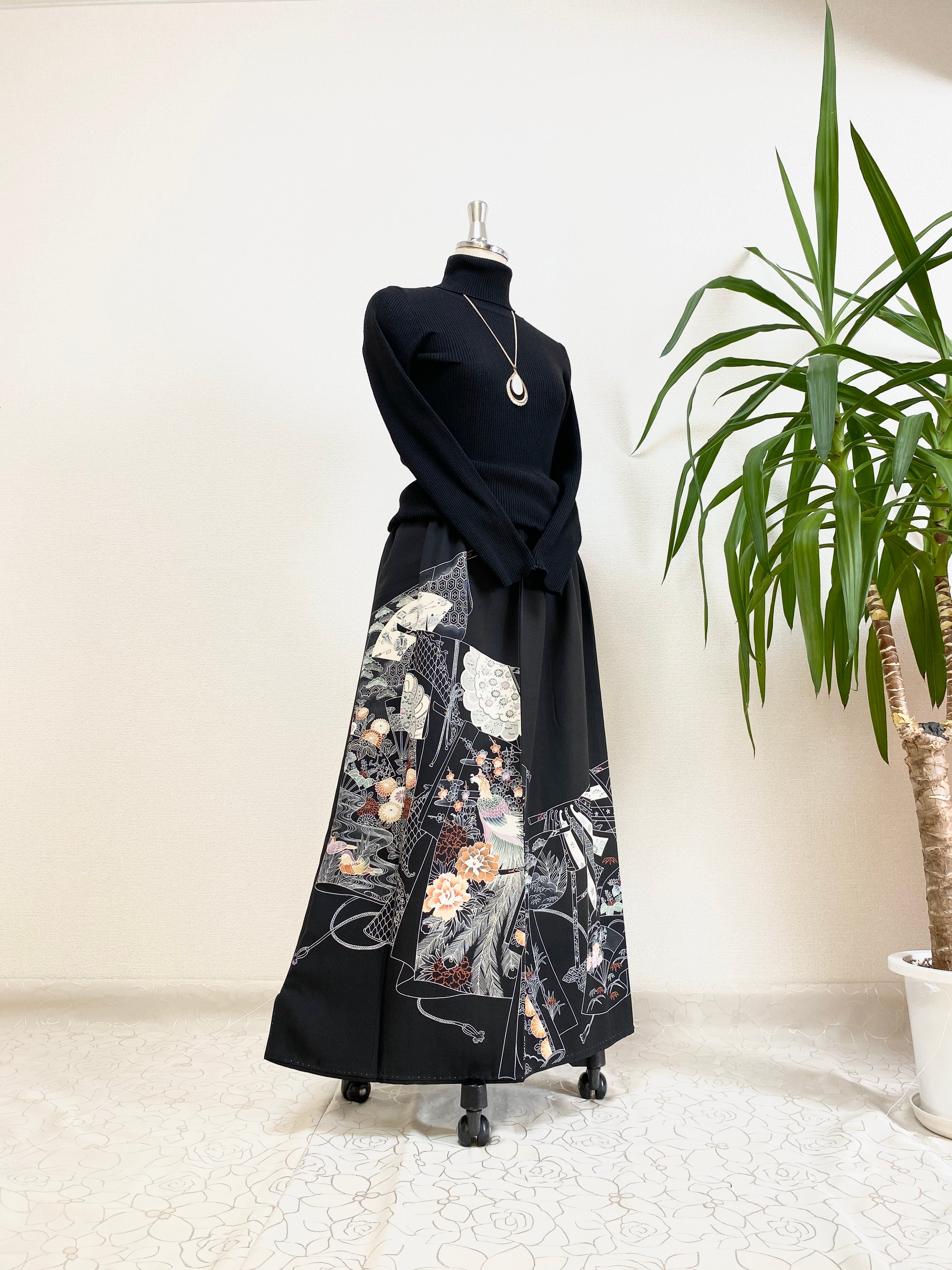 黒留袖着物リメイクウエストゴムロングスカート送料無料フリーサイズ1点物黒留袖着物リメイクウエストゴムロングスカートハンドメイド黒留袖着物リメイクロングスカート1点物NO.1103