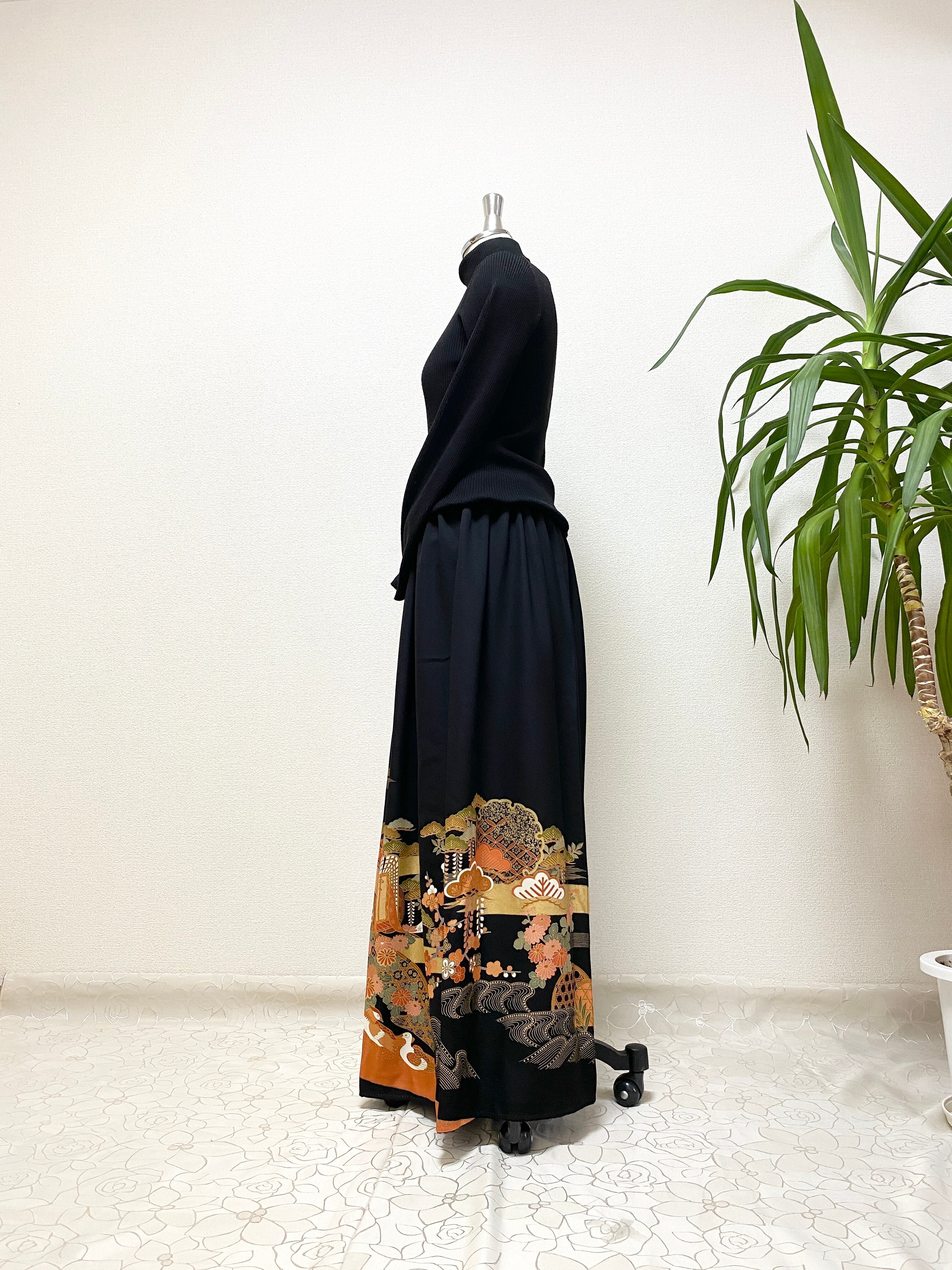 黒留袖着物リメイクウエストゴムロングドレススカートフリーサイズ【超ロング丈】