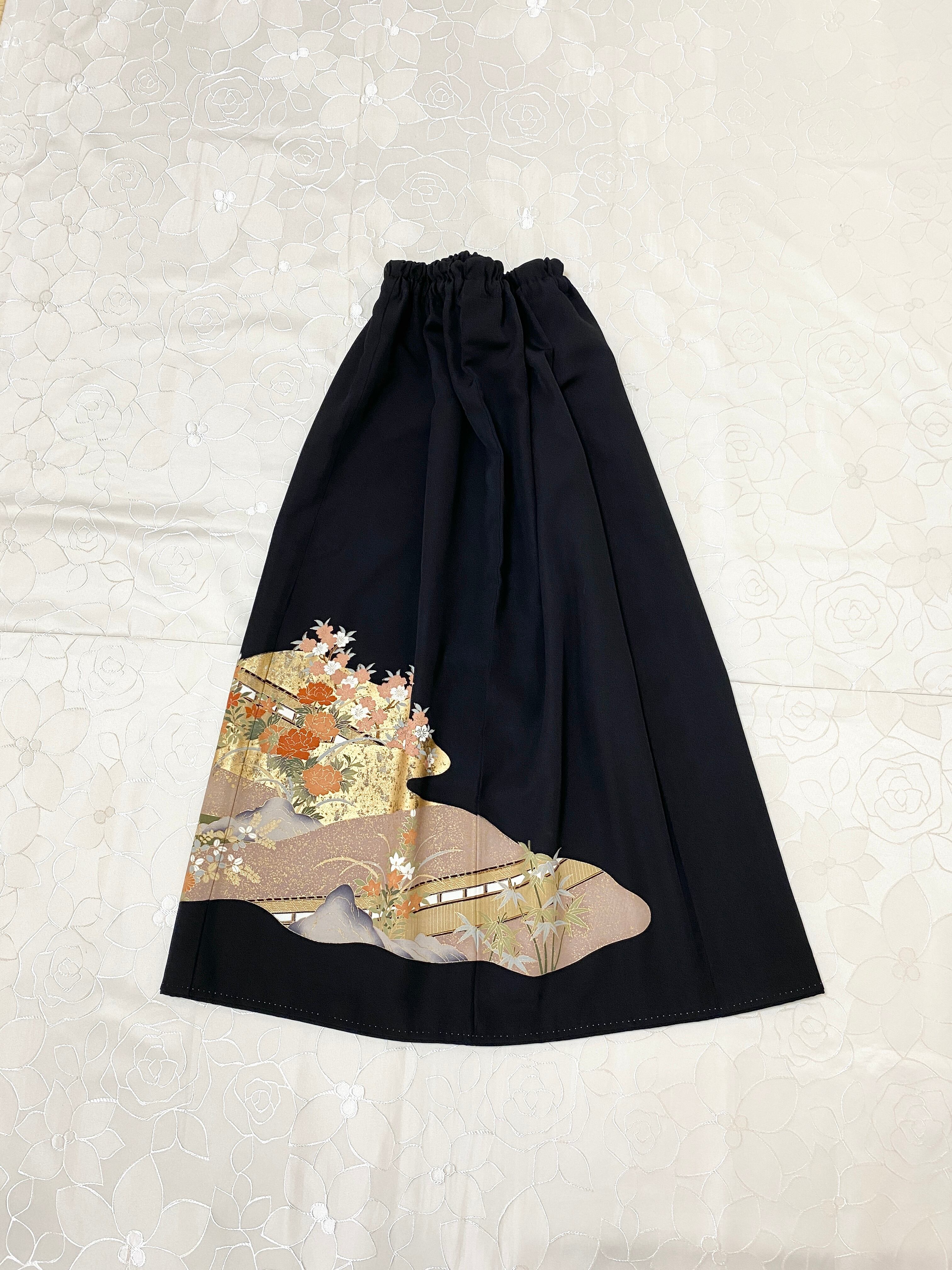黒留袖着物リメイクウエストゴムロングスカート送料無料フリーサイズ1点物黒留袖着物リメイクウエストゴムロングスカートハンドメイドNO.1212
