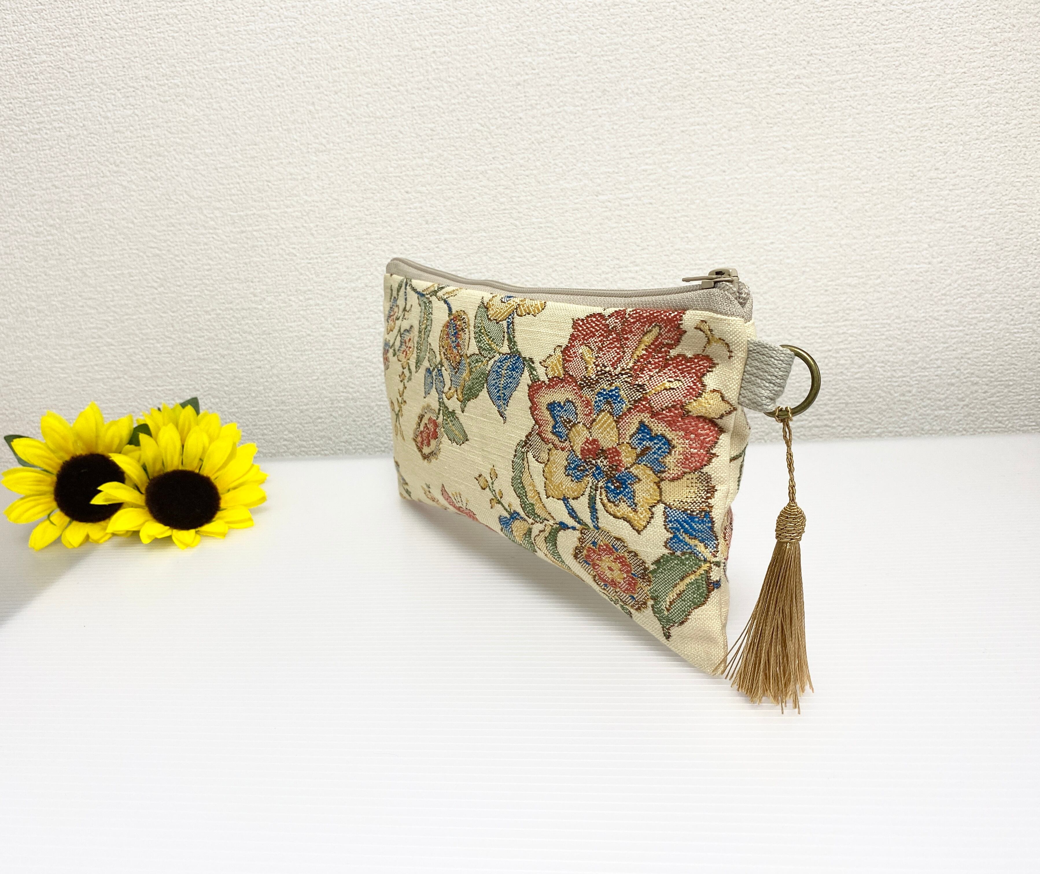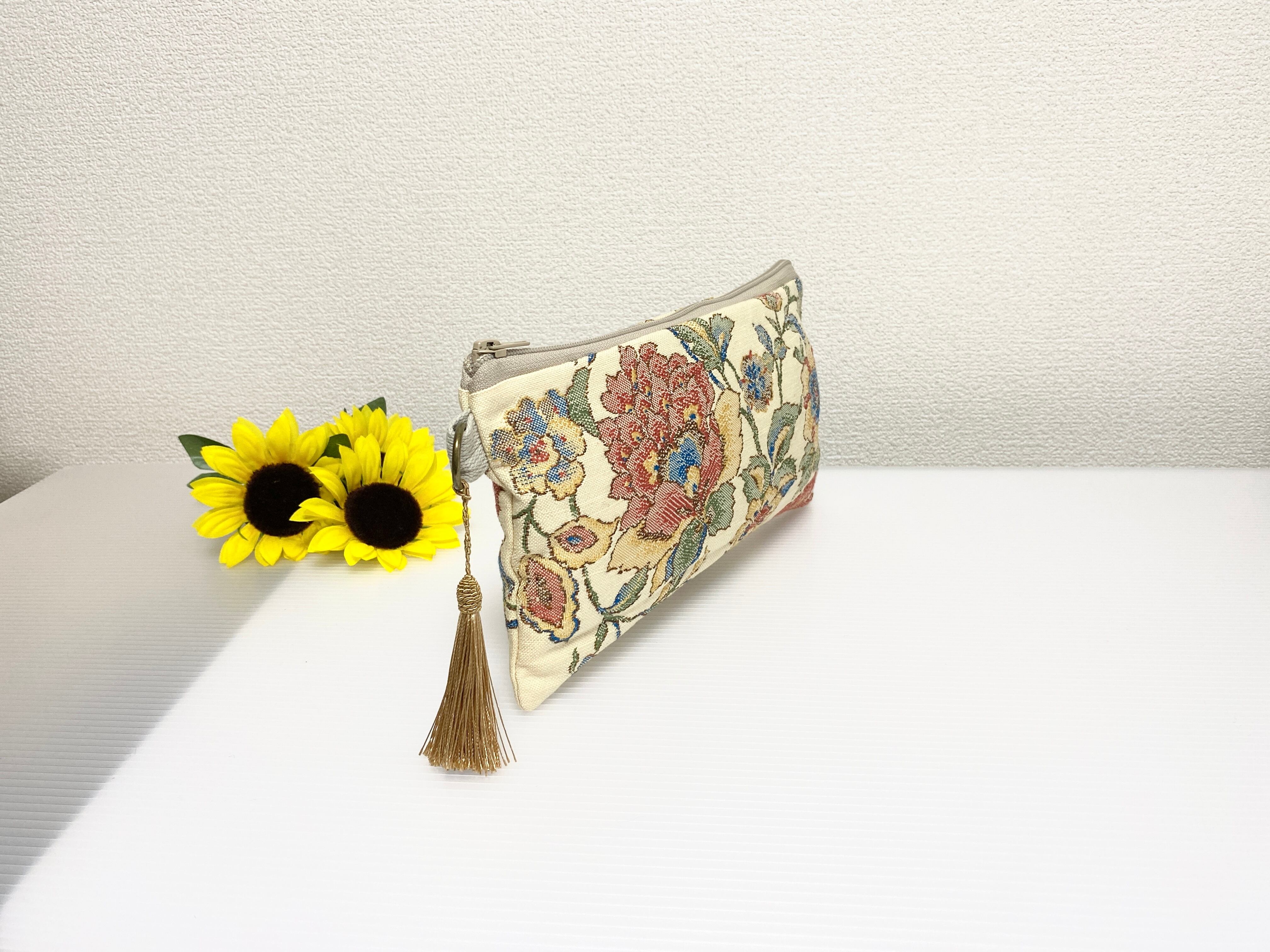 日本の古帯をリメイクして作製したポーチでハンドメイド品です。