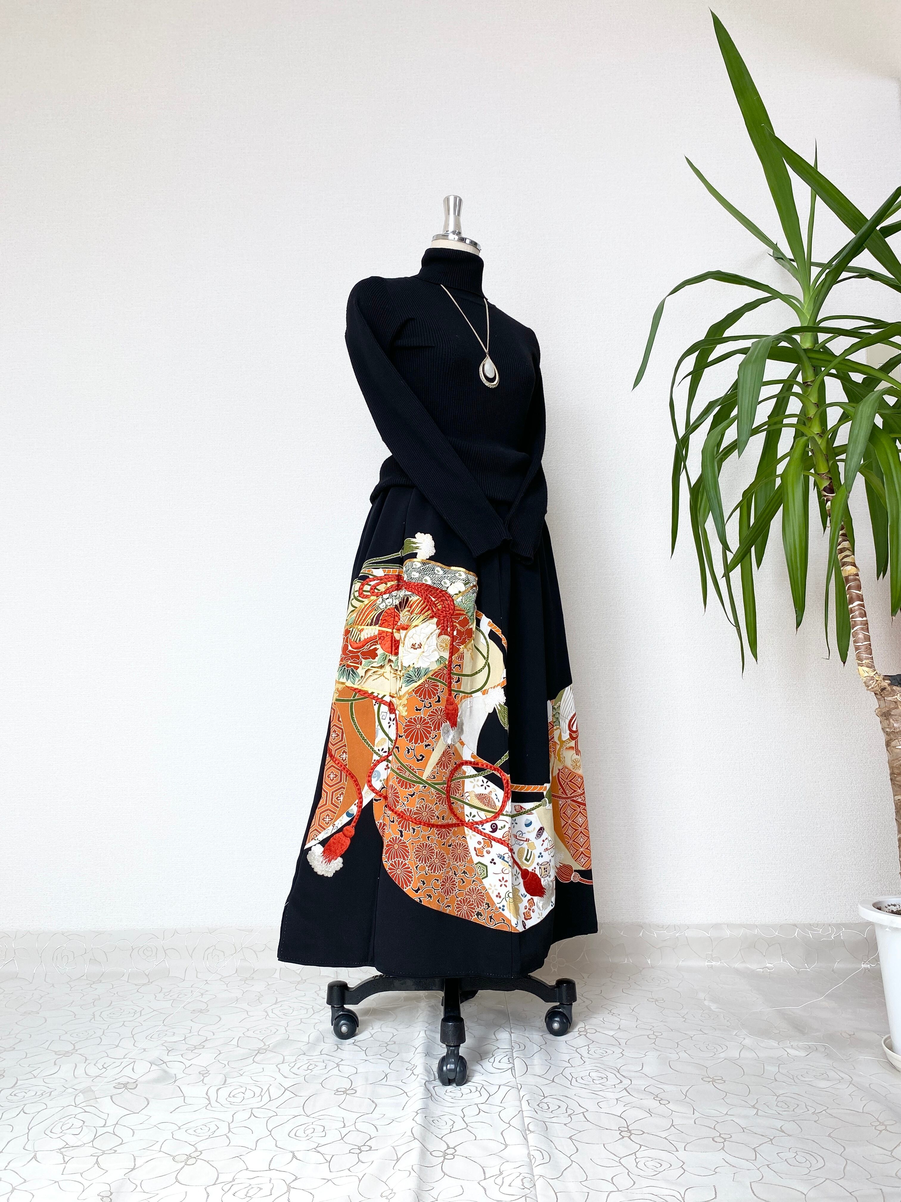 黒留袖着物リメイクウエストゴムロングスカート送料無料フリーサイズ1点物黒留袖着物リメイクウエストゴムロングスカートハンドメイドNO.1234