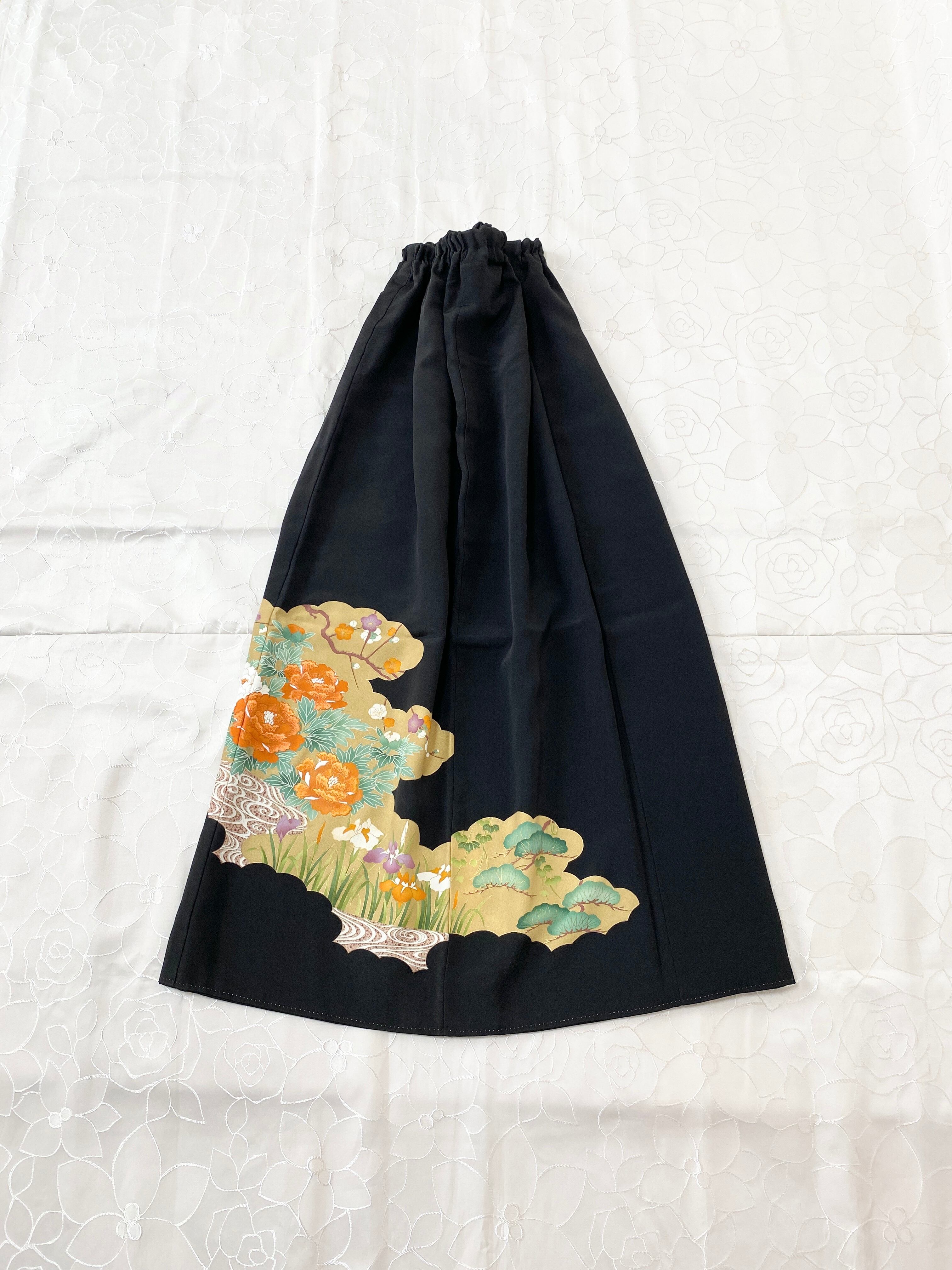 黒留袖着物をリメイクして作製したウエストゴムロングドレススカートフリーサイズ【超ロング丈】です。