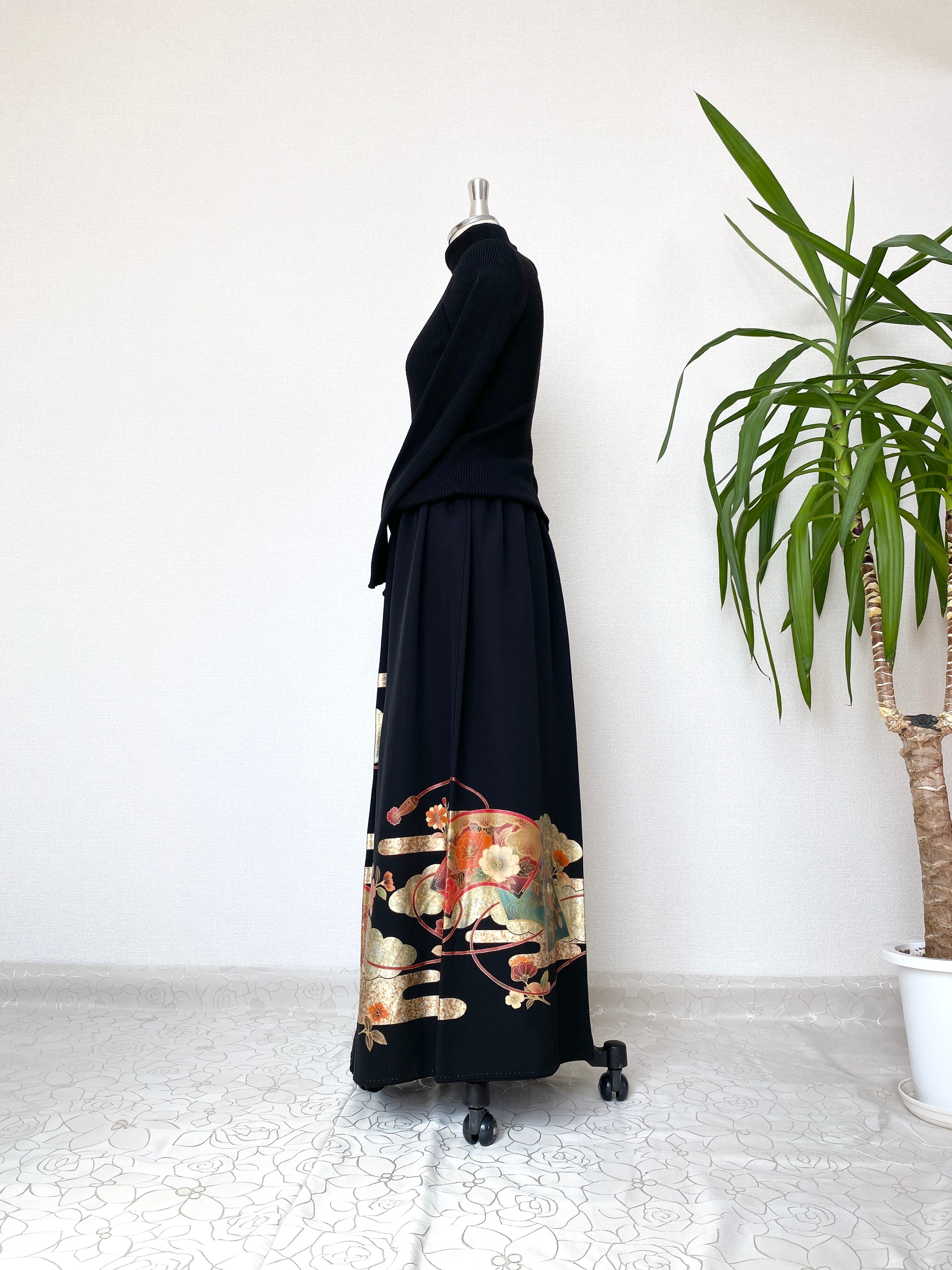 黒留袖着物リメイクウエストゴムロングスカート送料無料フリーサイズ1点物黒留袖着物リメイクウエストゴムロングスカートハンドメイドNO.1255