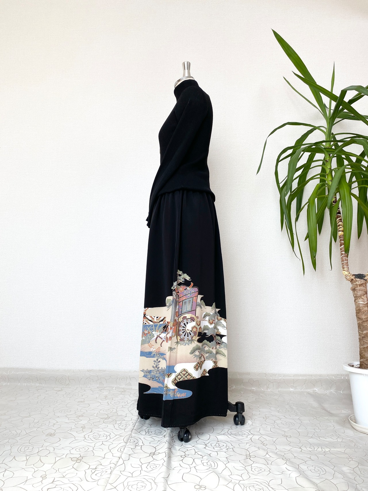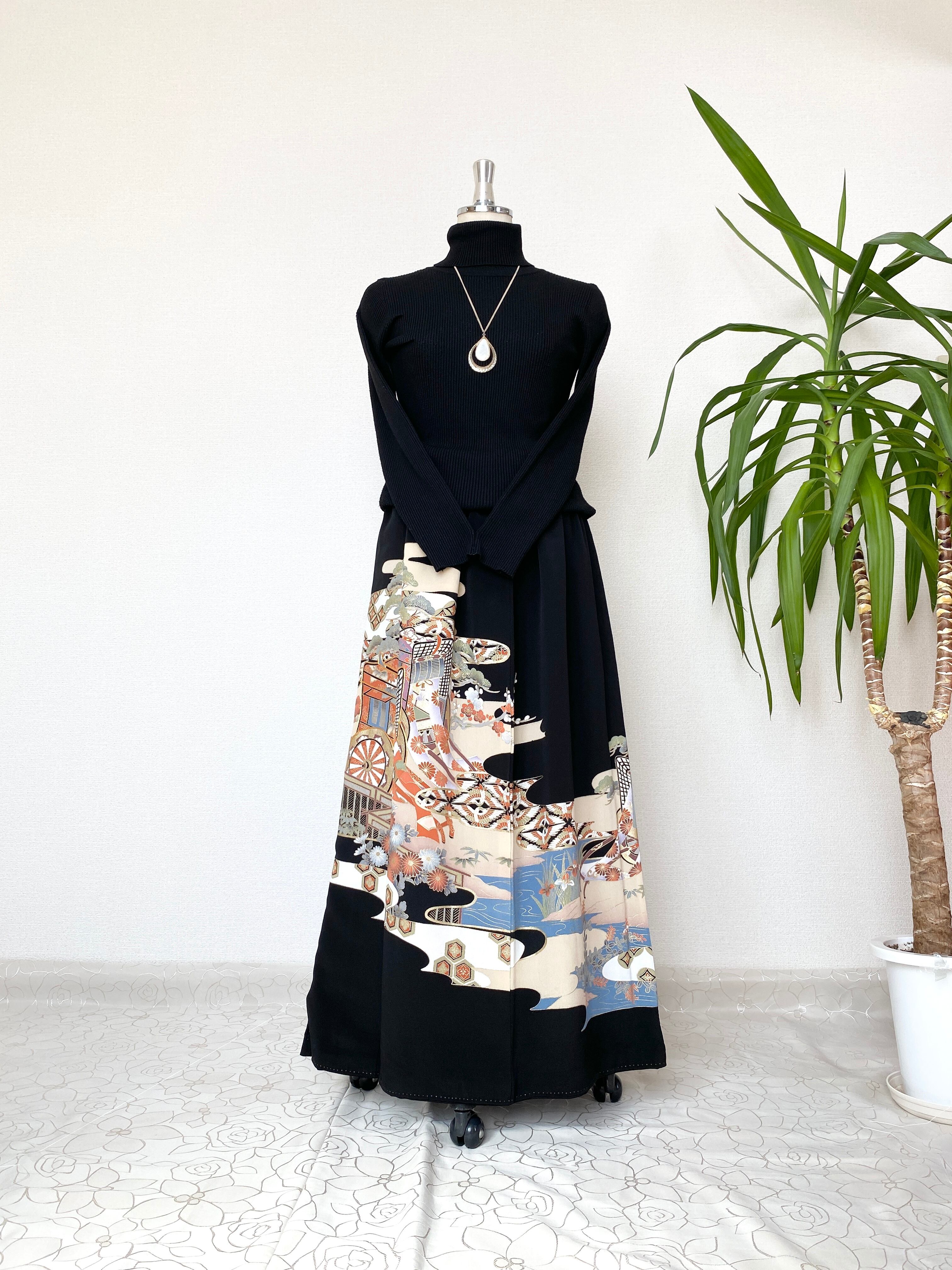 黒留袖着物リメイクウエストゴムロングスカートフリーサイズ