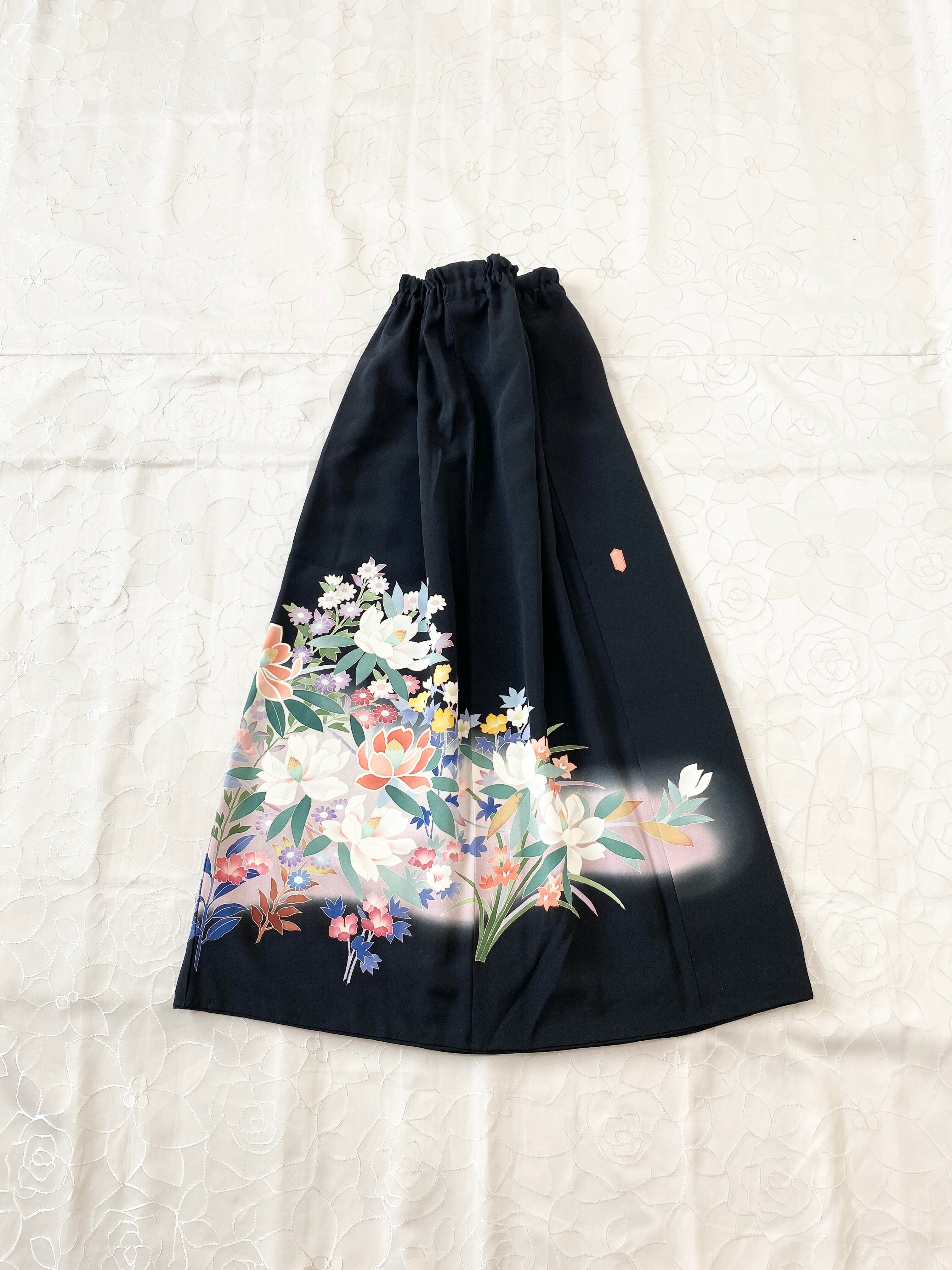 黒留袖着物をリメイクして作製したウエストゴムロングドレススカートフリーサイズ【超ロング丈】です。