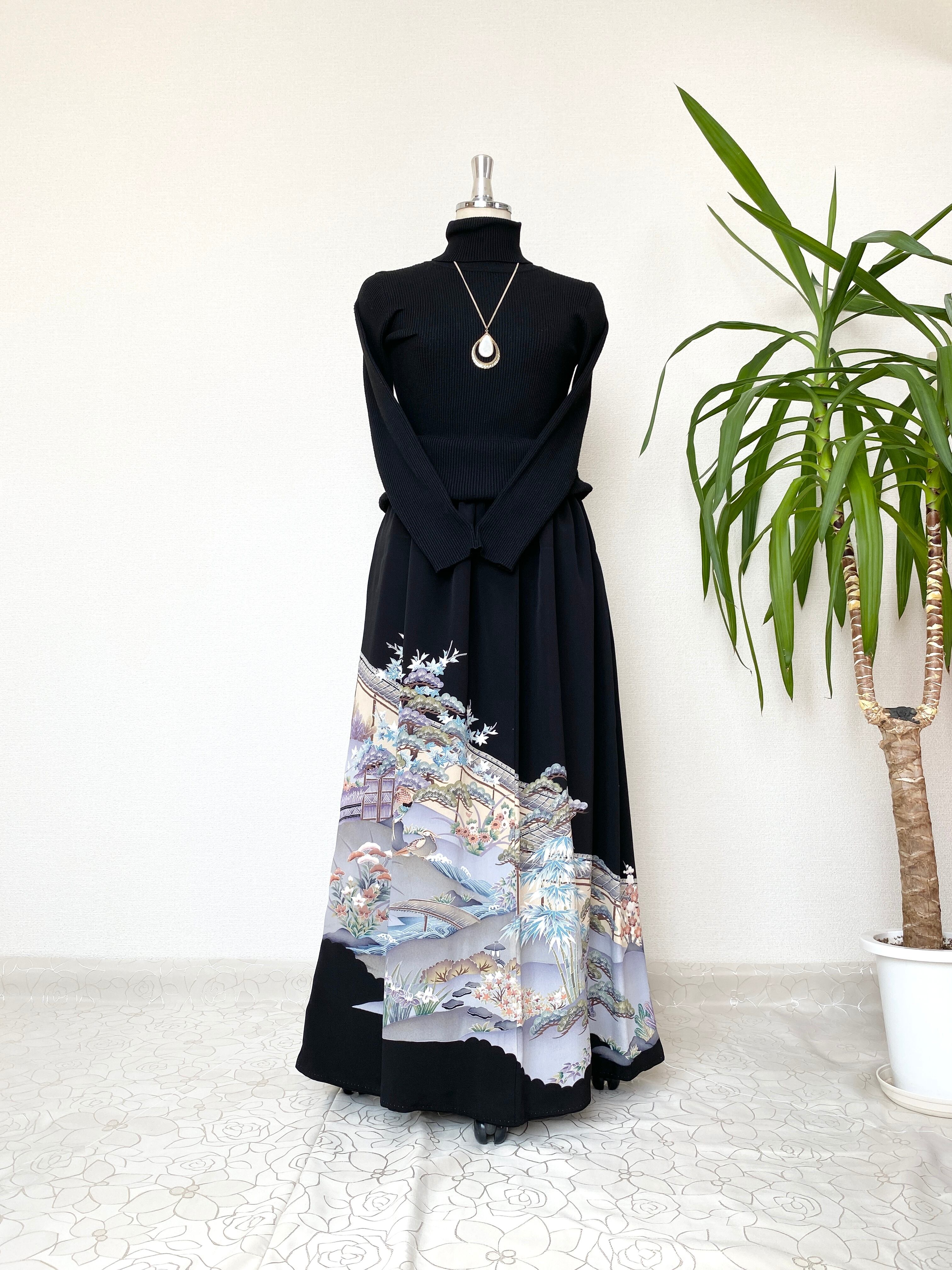 黒留袖着物リメイクウエストゴムロングスカート【超ロング丈】ロングスカート送料無料フリーサイズ黒留袖着物リメイクウエストゴムロングスカート1点物NO.1266
