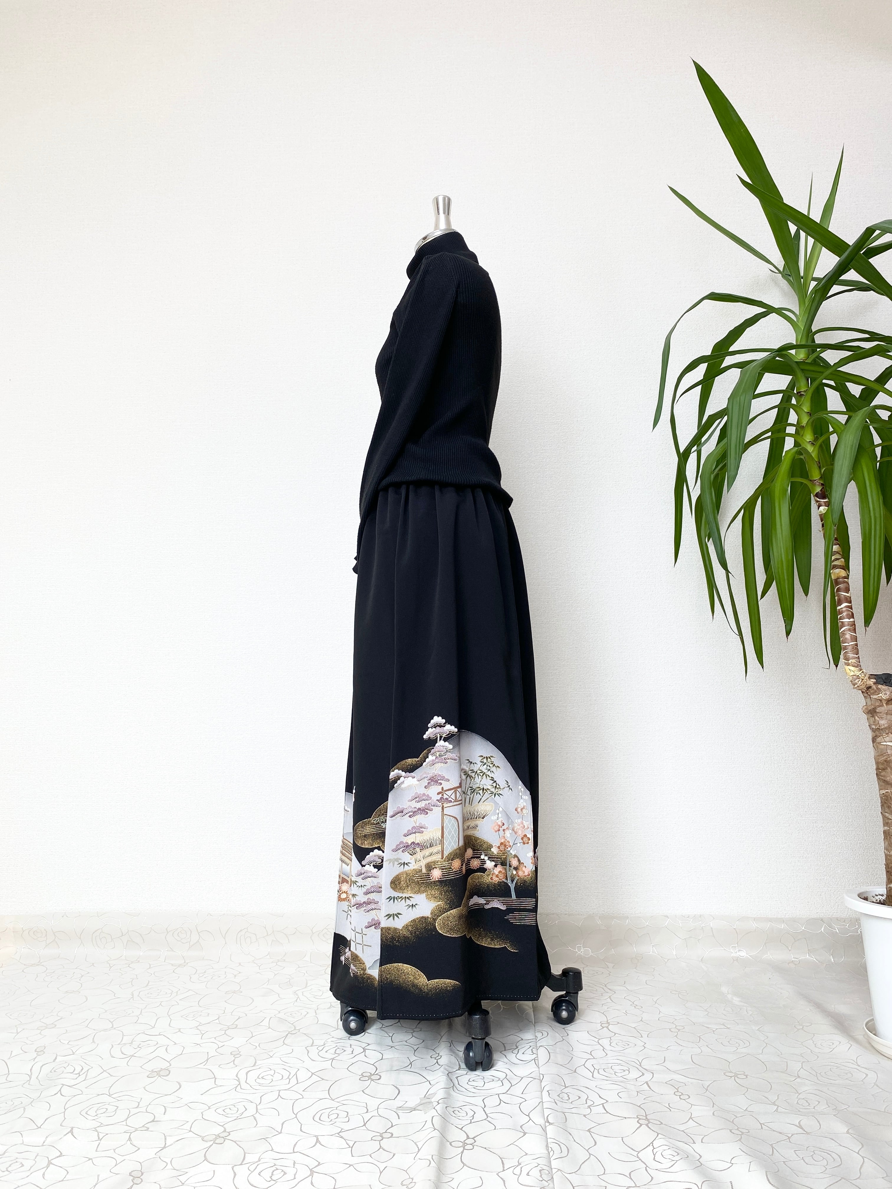 黒留袖着物リメイクウエストゴムロングドレススカートフリーサイズ【超ロング丈】