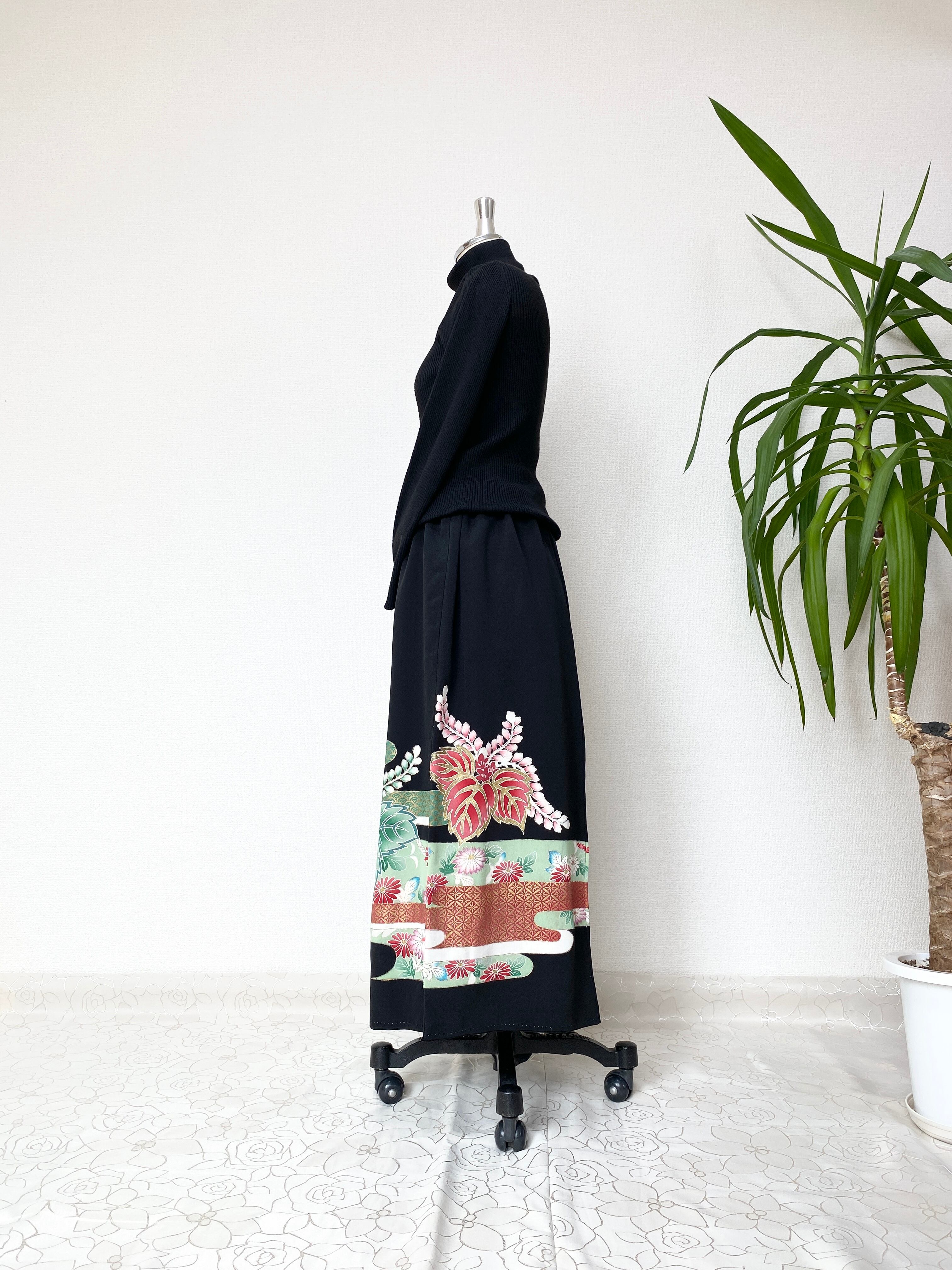黒留袖着物リメイクウエストゴムロングスカート送料無料フリーサイズ1点物黒留袖着物リメイクウエストゴムロングスカートハンドメイド黒留袖着物リメイクロングスカート1点物NO.1351