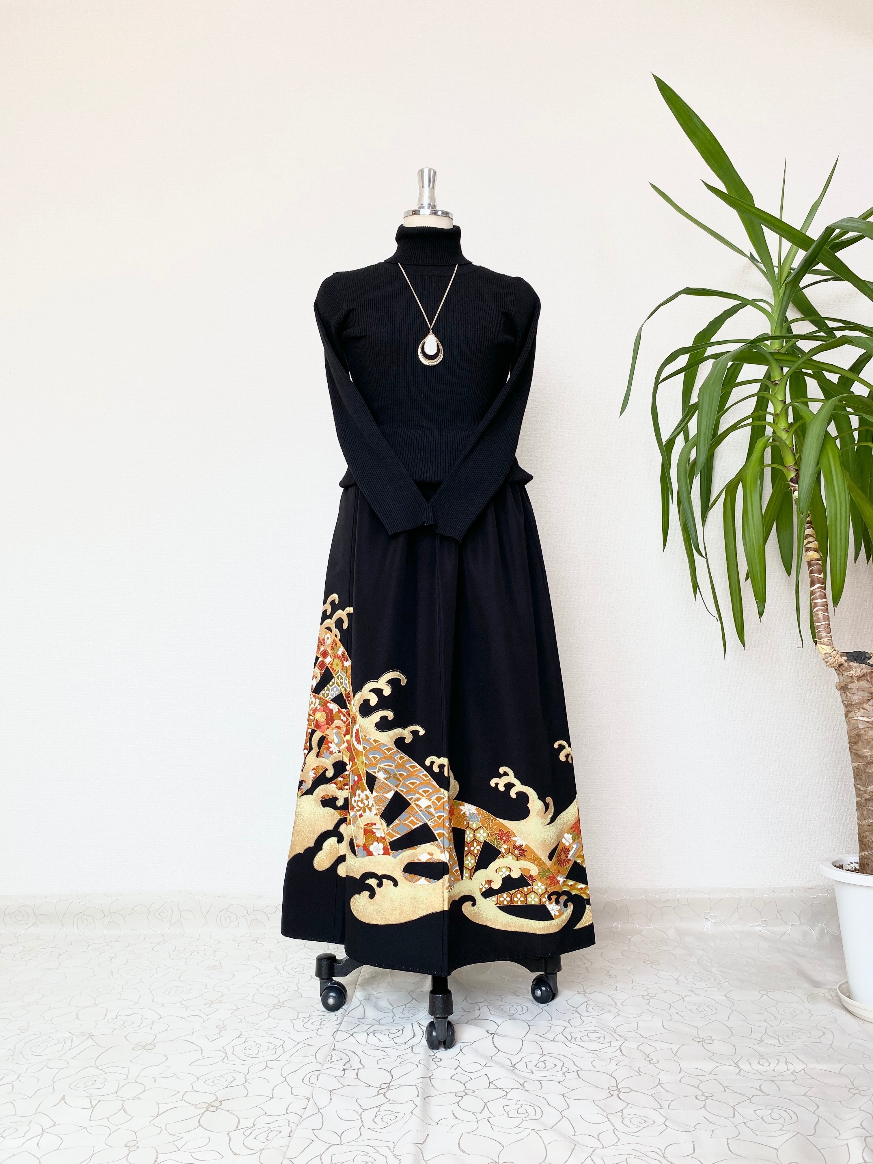 黒留袖着物リメイクウエストゴムロングスカート送料無料フリーサイズ1点物黒留袖着物リメイクウエストゴムロングスカートハンドメイド黒留袖着物リメイクロングスカート1点物NO.1362