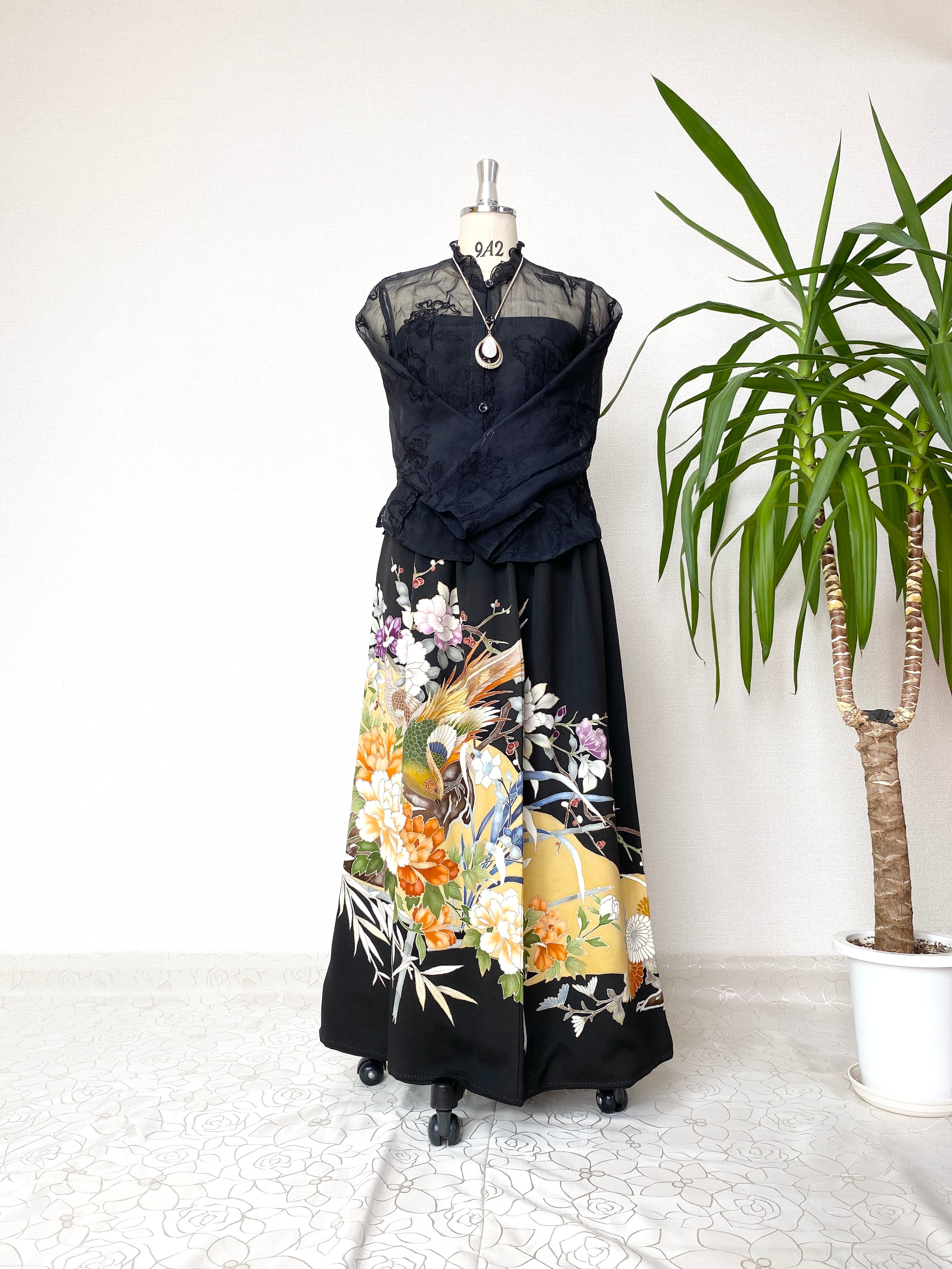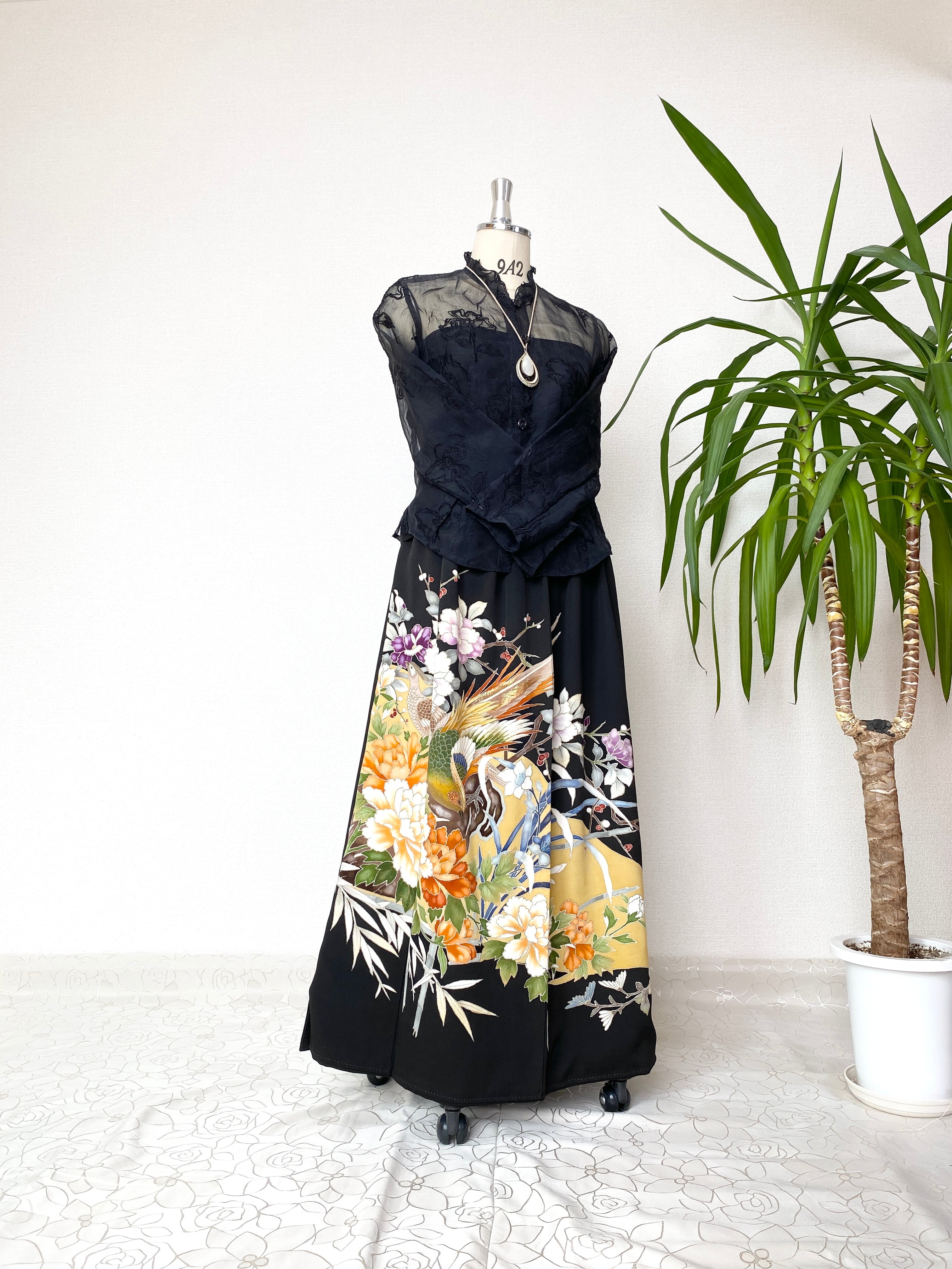 黒留袖着物リメイクウエストゴムロングスカート送料無料フリーサイズ1点物黒留袖着物リメイクウエストゴムロングスカートハンドメイド黒留袖着物リメイクロングスカート1点物NO.1429