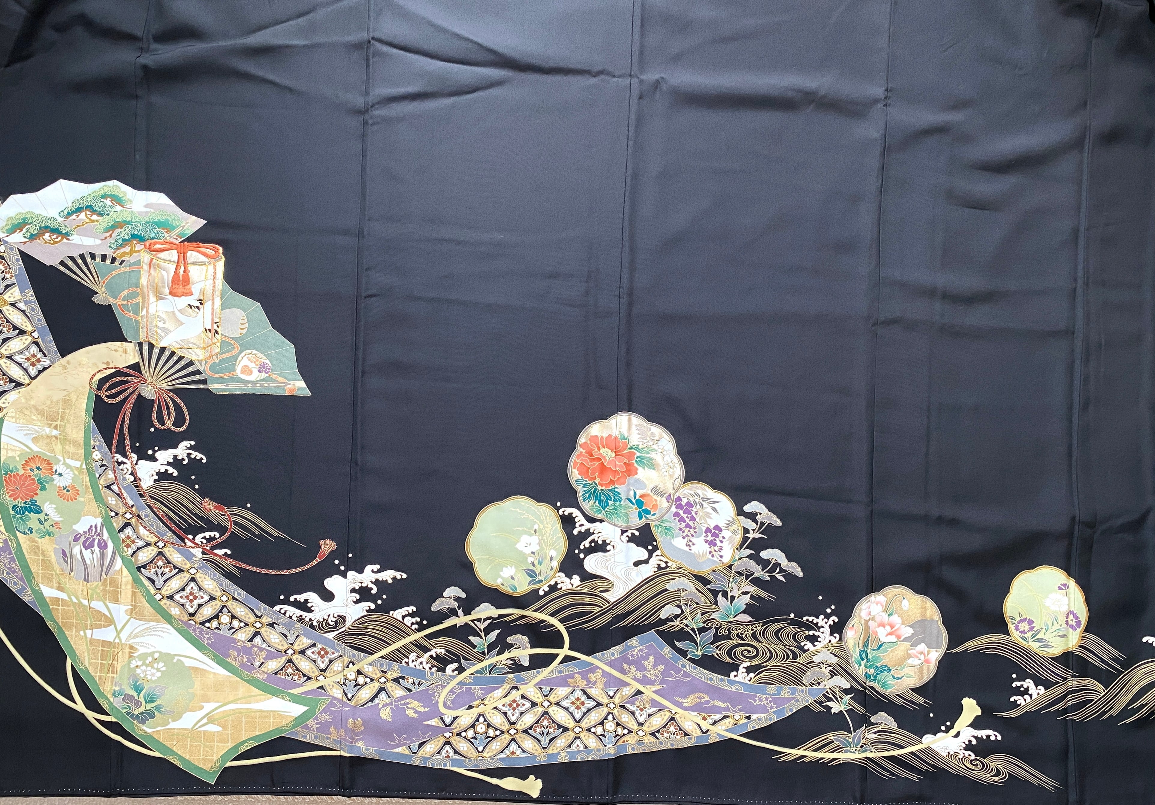 黒留袖着物リメイクウエストゴムロングスカート送料無料フリーサイズ1点物黒留袖着物リメイクウエストゴムロングスカートハンドメイド黒留袖着物リメイクロングスカート1点物NO.1441