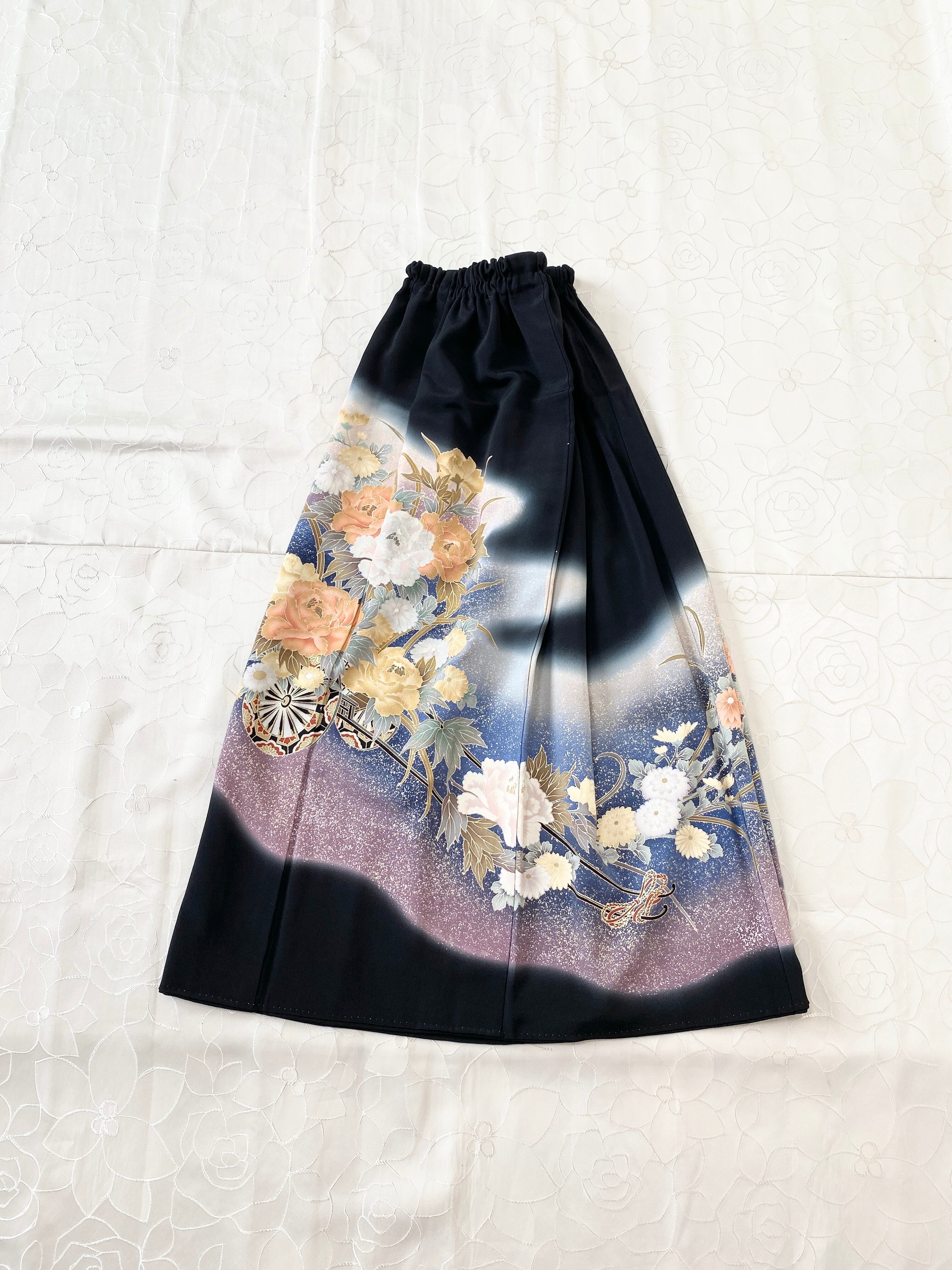 黒留袖着物をリメイクして作製したウエストゴムロングドレススカートフリーサイズ【超ロング丈】です。