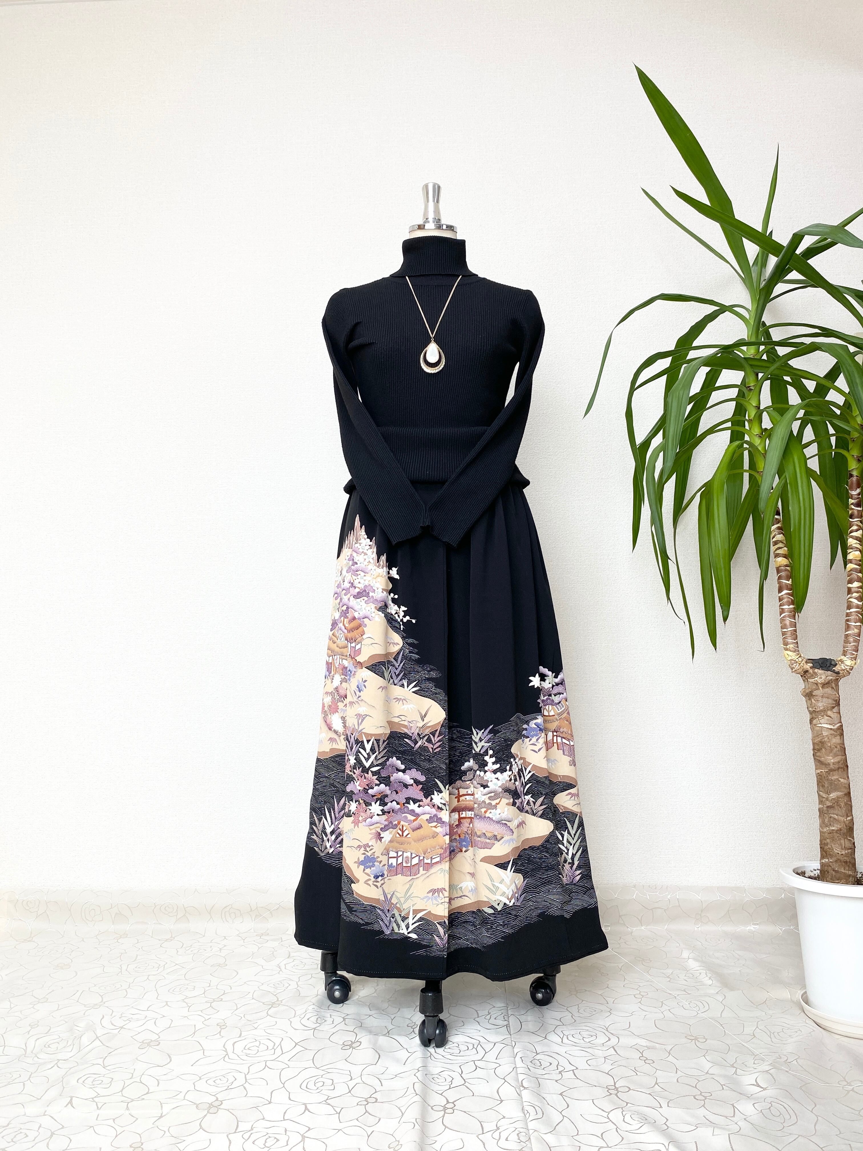 黒留袖着物リメイクウエストゴムロングスカート送料無料フリーサイズ1点物黒留袖着物リメイクウエストゴムロングスカートハンドメイド黒留袖着物リメイクロングスカート1点物NO.1290