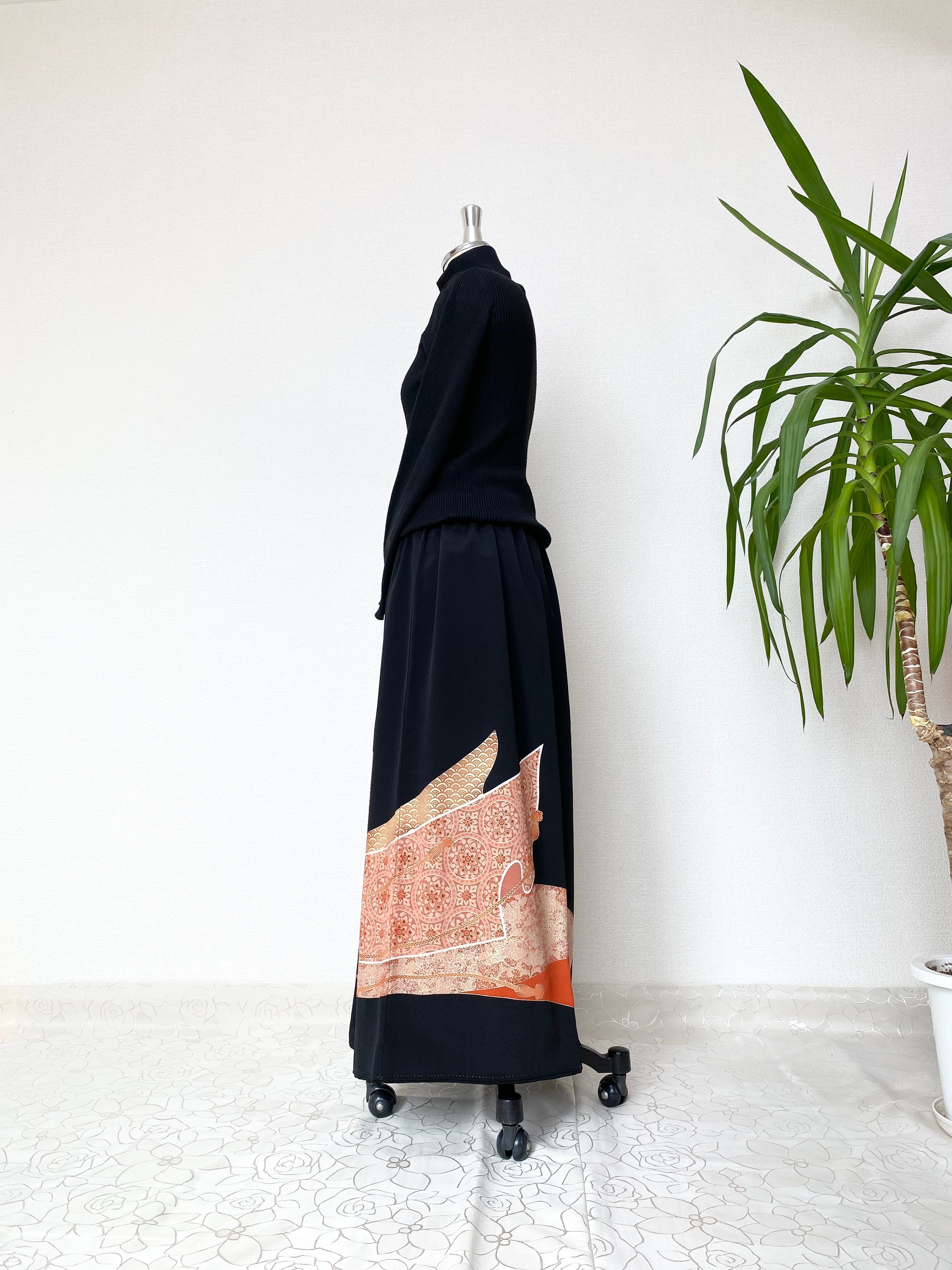 黒留袖着物リメイクウエストゴムロングスカート送料無料フリーサイズ1点物黒留袖着物リメイクウエストゴムロングスカートハンドメイド黒留袖着物リメイクロングスカート1点物NO.1338
