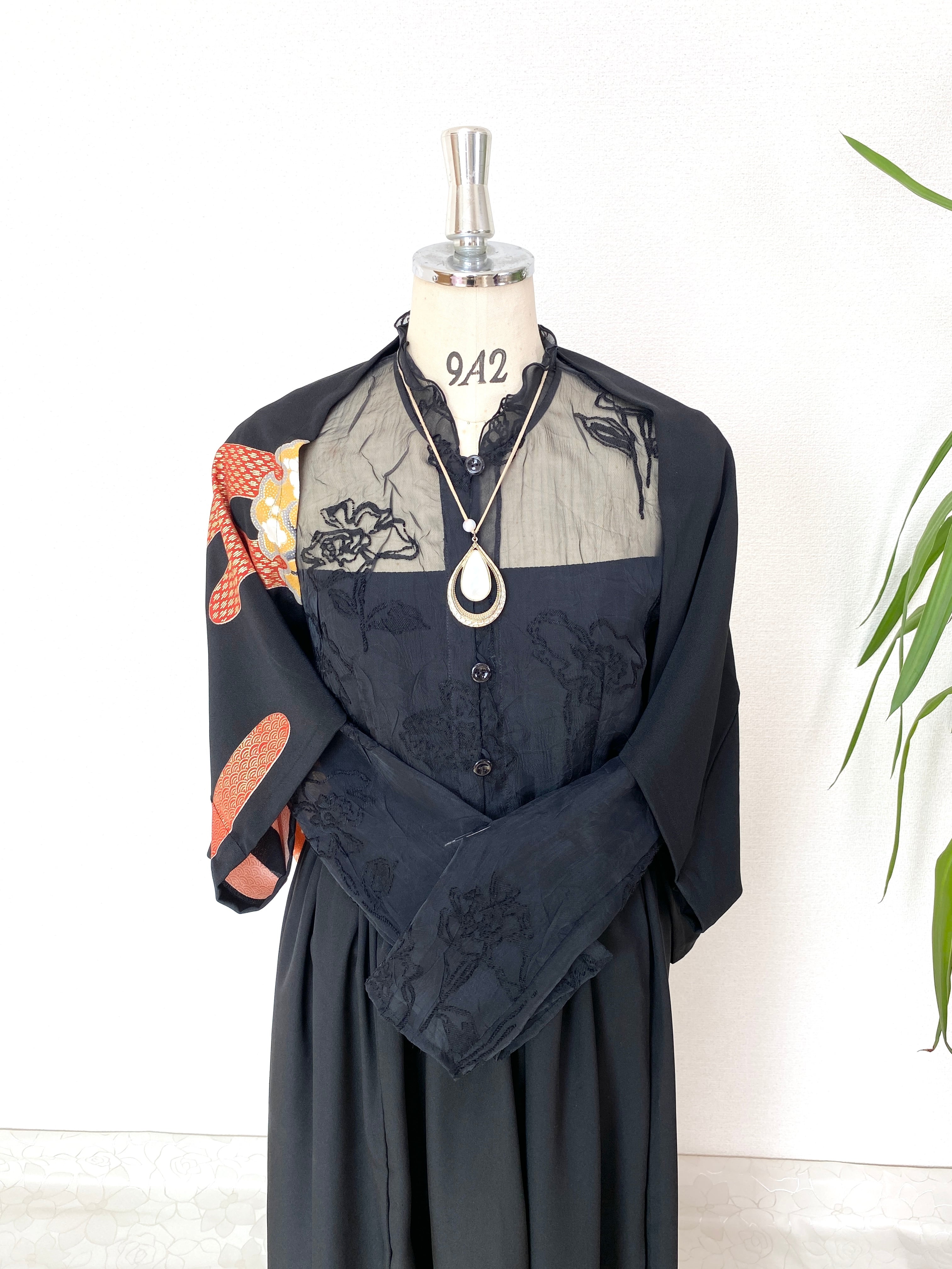 黒留袖着物リメイク羽織物ストールショールカーディガンストール送料無料ハンドメイド黒留袖着物リメイクショール羽織物NO.1520
