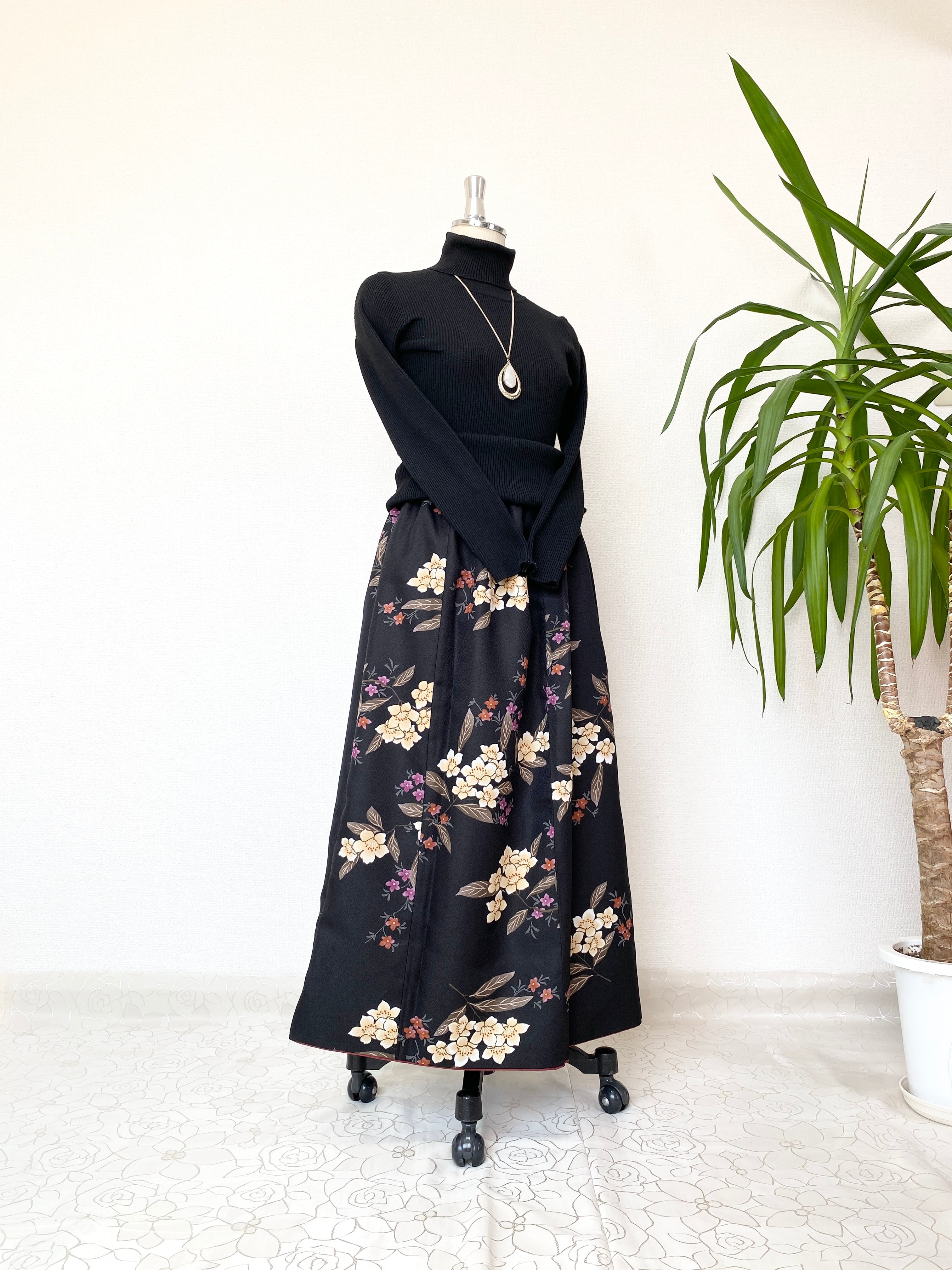 スカートは裏地も付いていてしっかりとした造りの着物リメイクスカートです。ウエスト回りのゴロつき無くスッキリとしたシルエットで着こなせます。