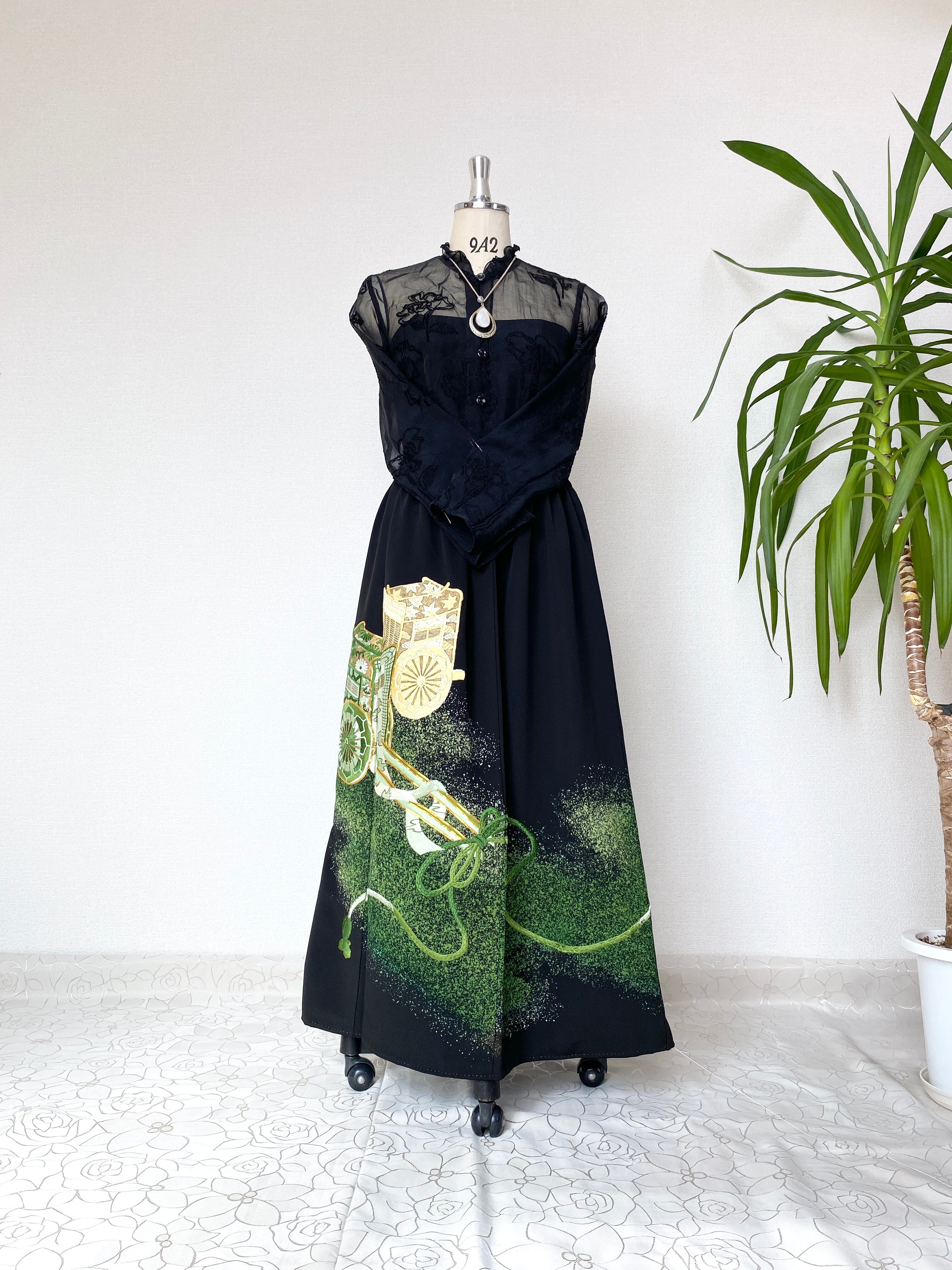 黒留袖着物リメイクウエストゴムロングスカートフリーサイズ