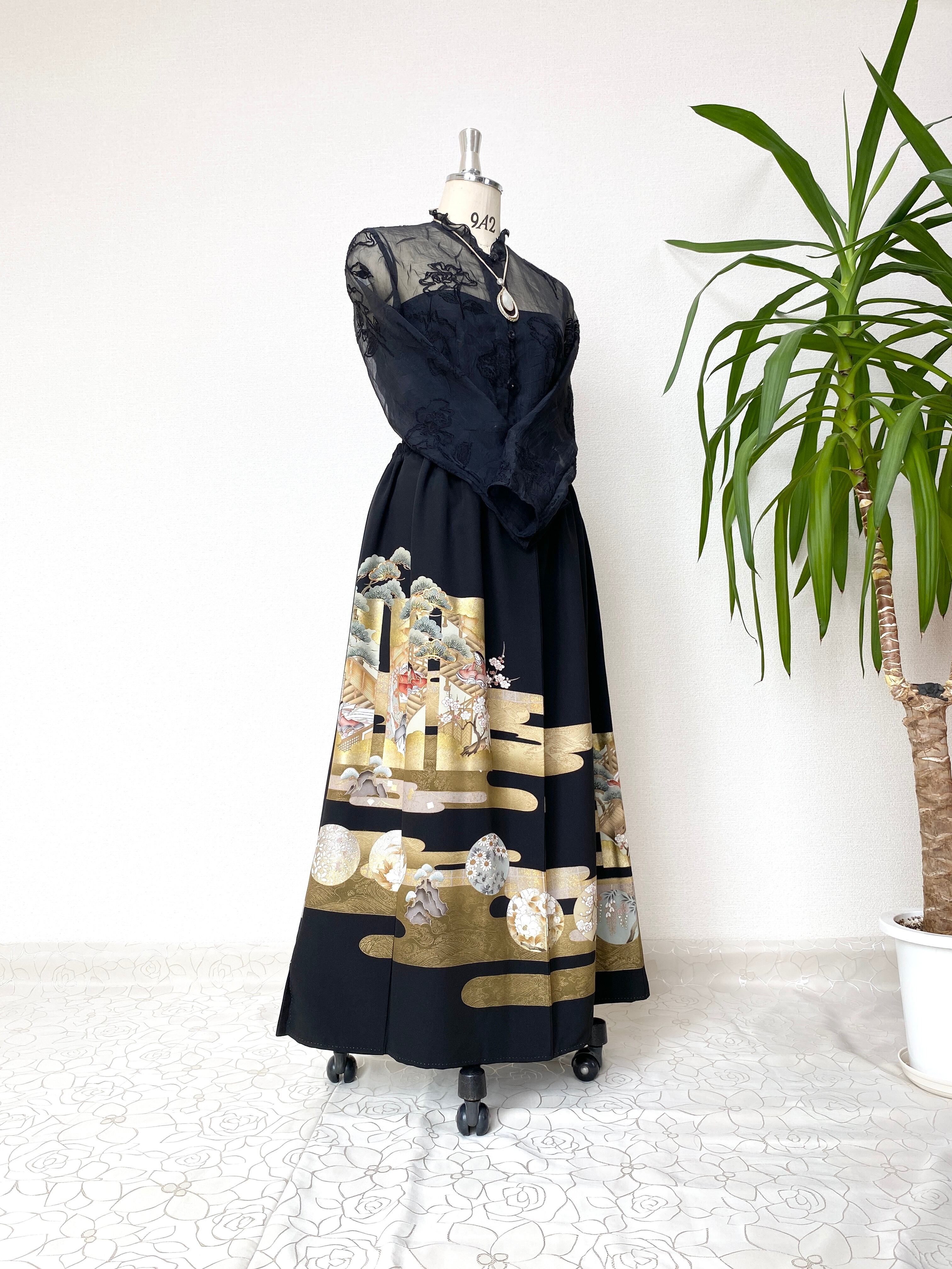 黒留袖着物リメイクウエストゴムロングスカートフリーサイズ