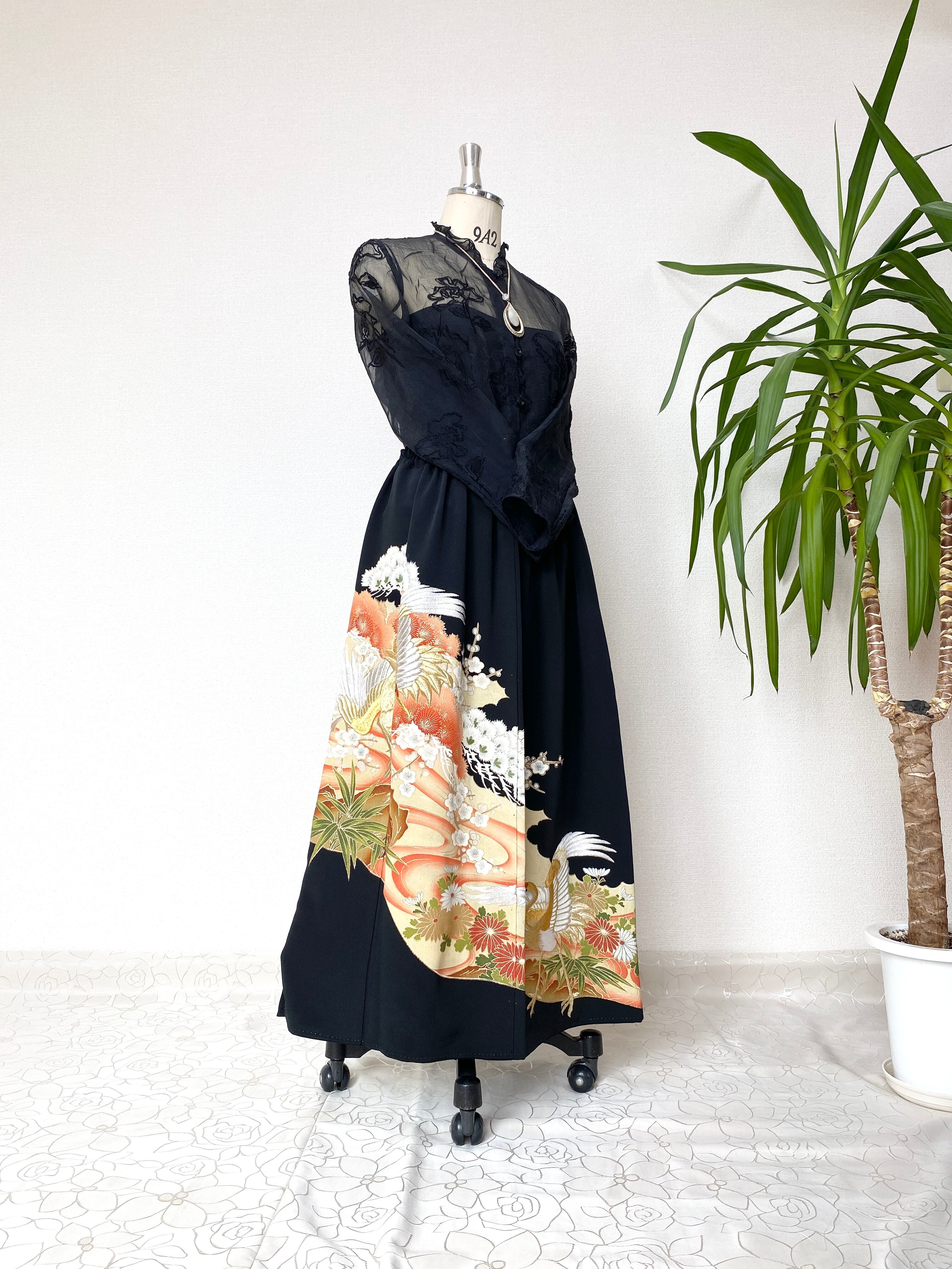 黒留袖着物リメイクウエストゴムロングスカートフリーサイズ