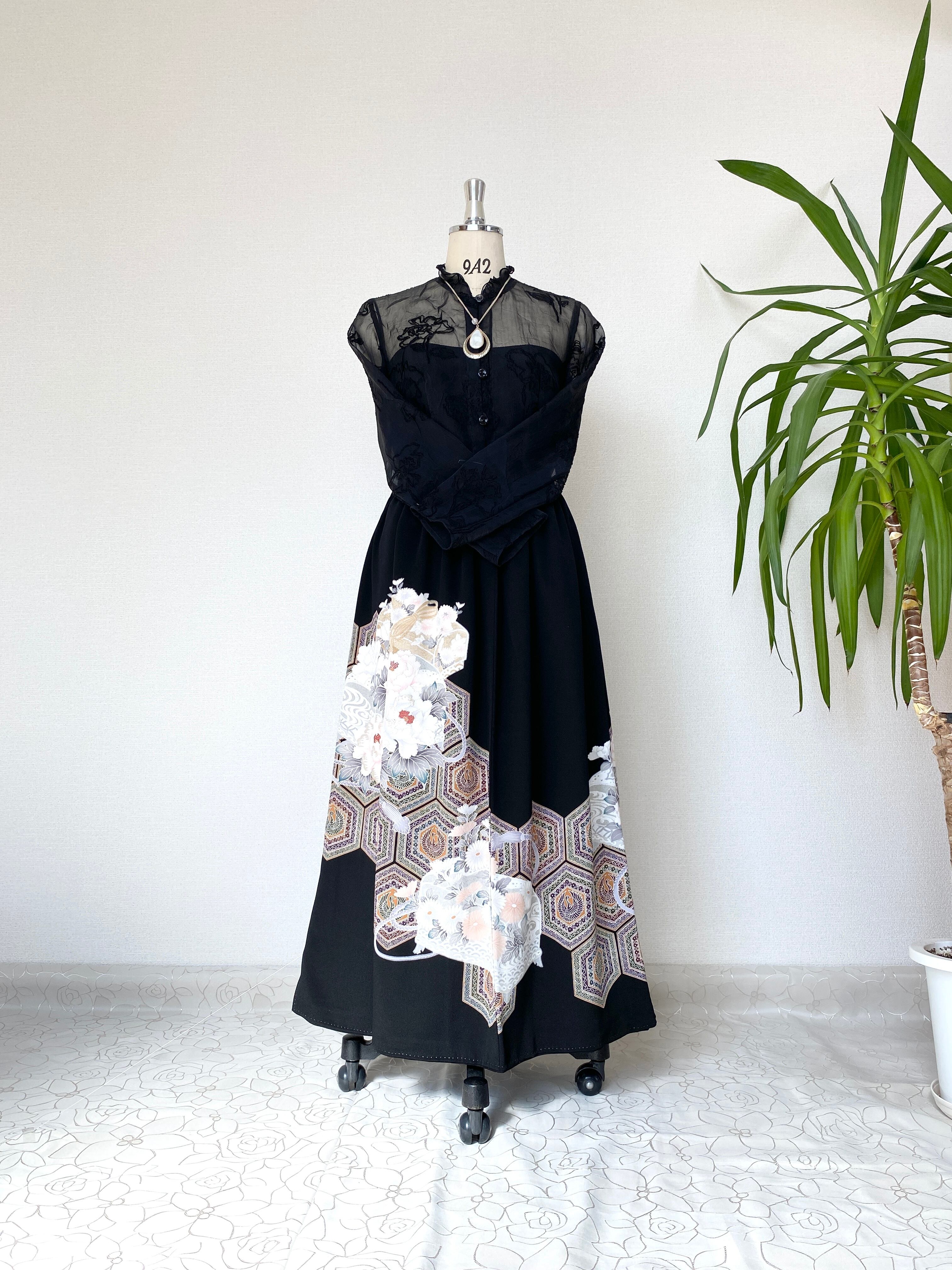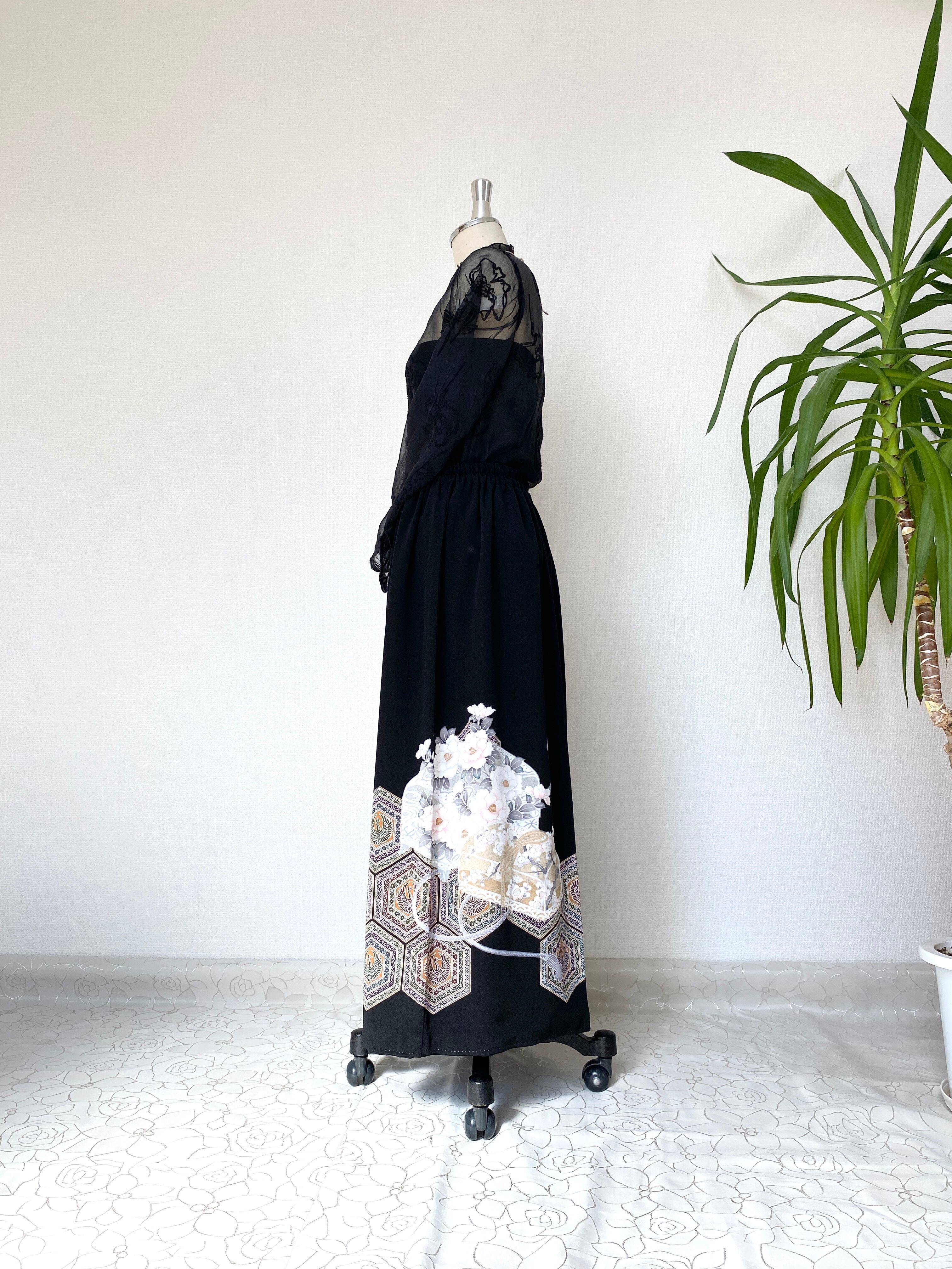 黒留袖着物リメイクウエストゴムロングスカートフリーサイズ