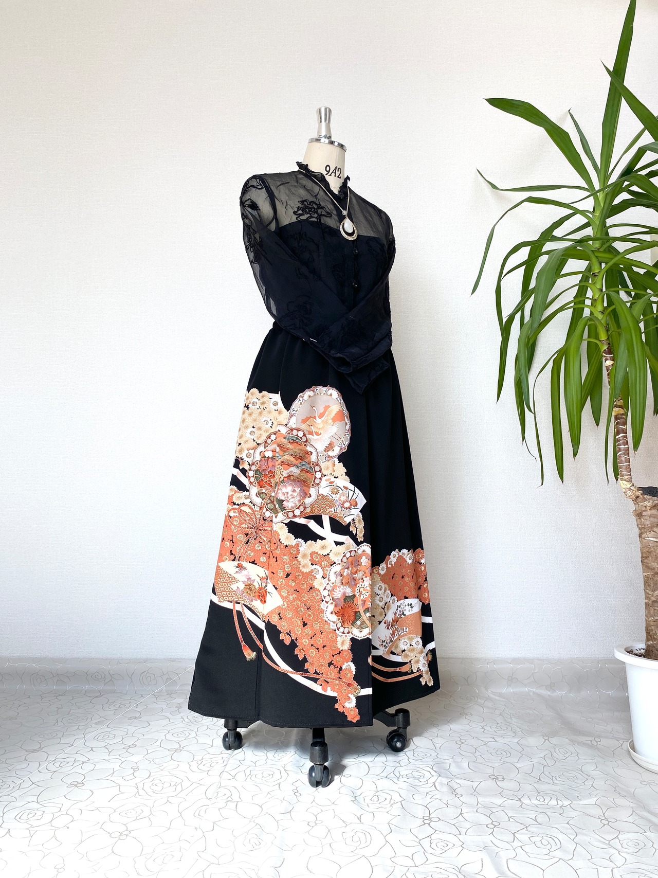 黒留袖着物リメイクウエストゴムロングスカートフリーサイズ