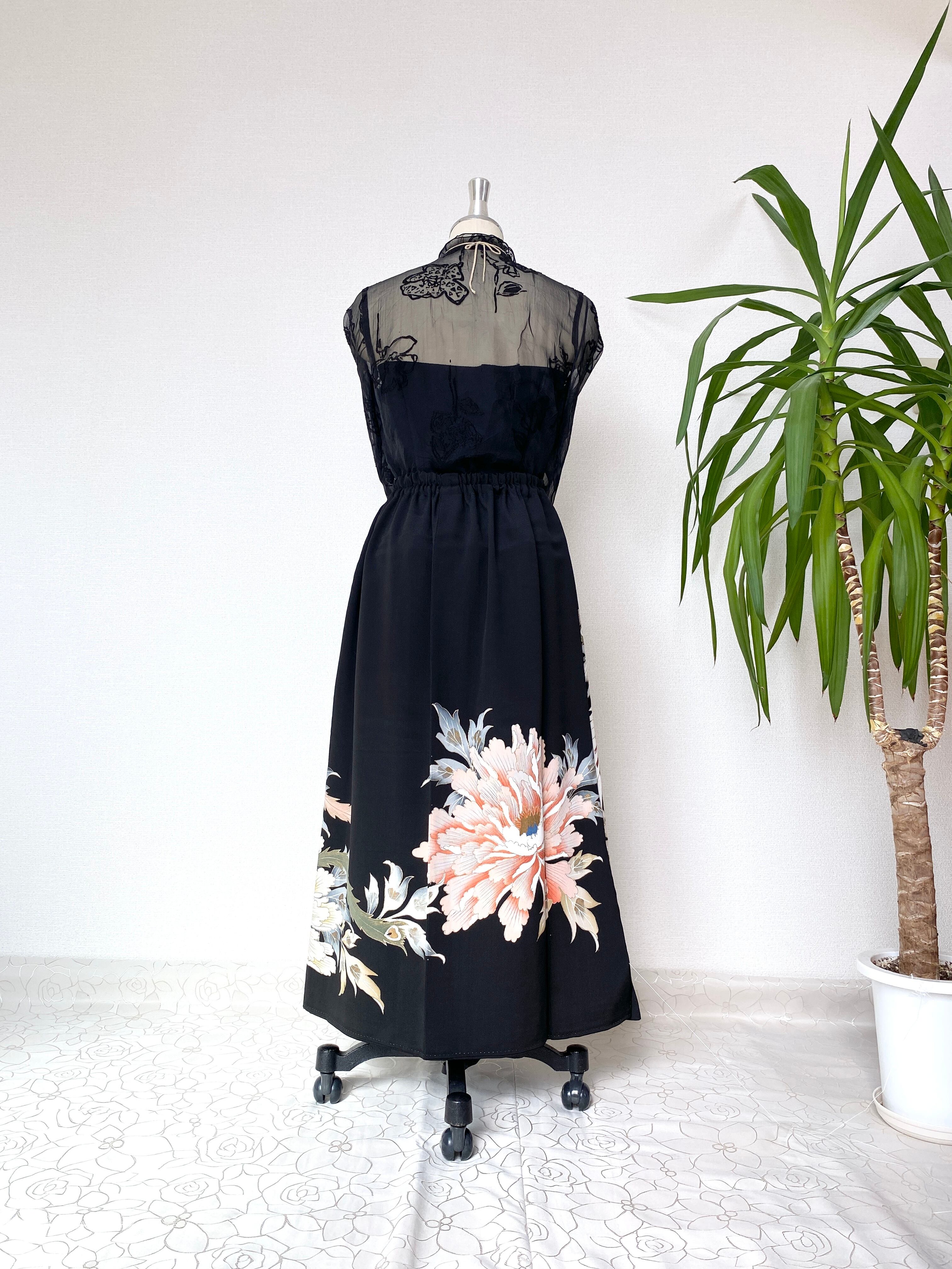 黒留袖着物をリメイクして作製したウエストゴムロングドレススカートフリーサイズです。