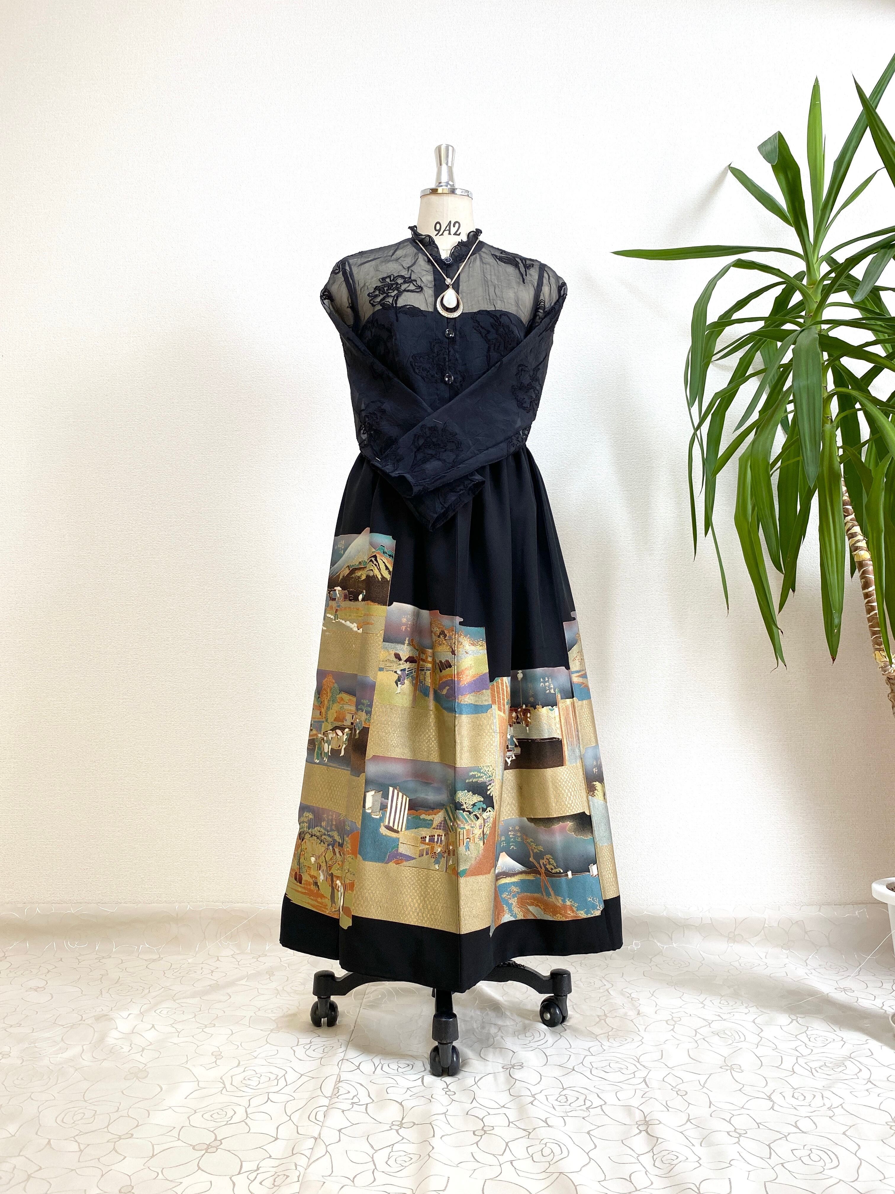黒留袖着物をリメイクして作製したウエストゴムロングドレススカートフリーサイズです。