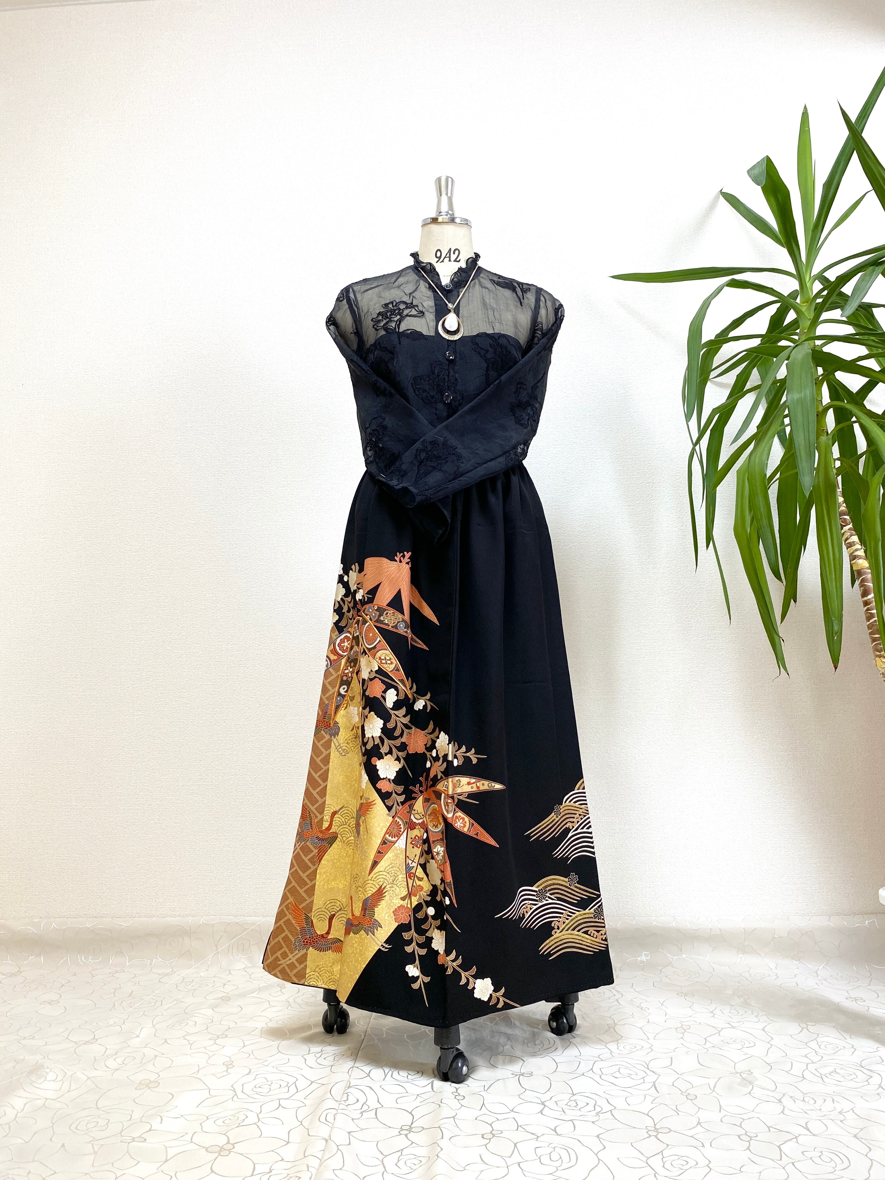 黒留袖着物リメイクウエストゴムロングスカートフリーサイズ