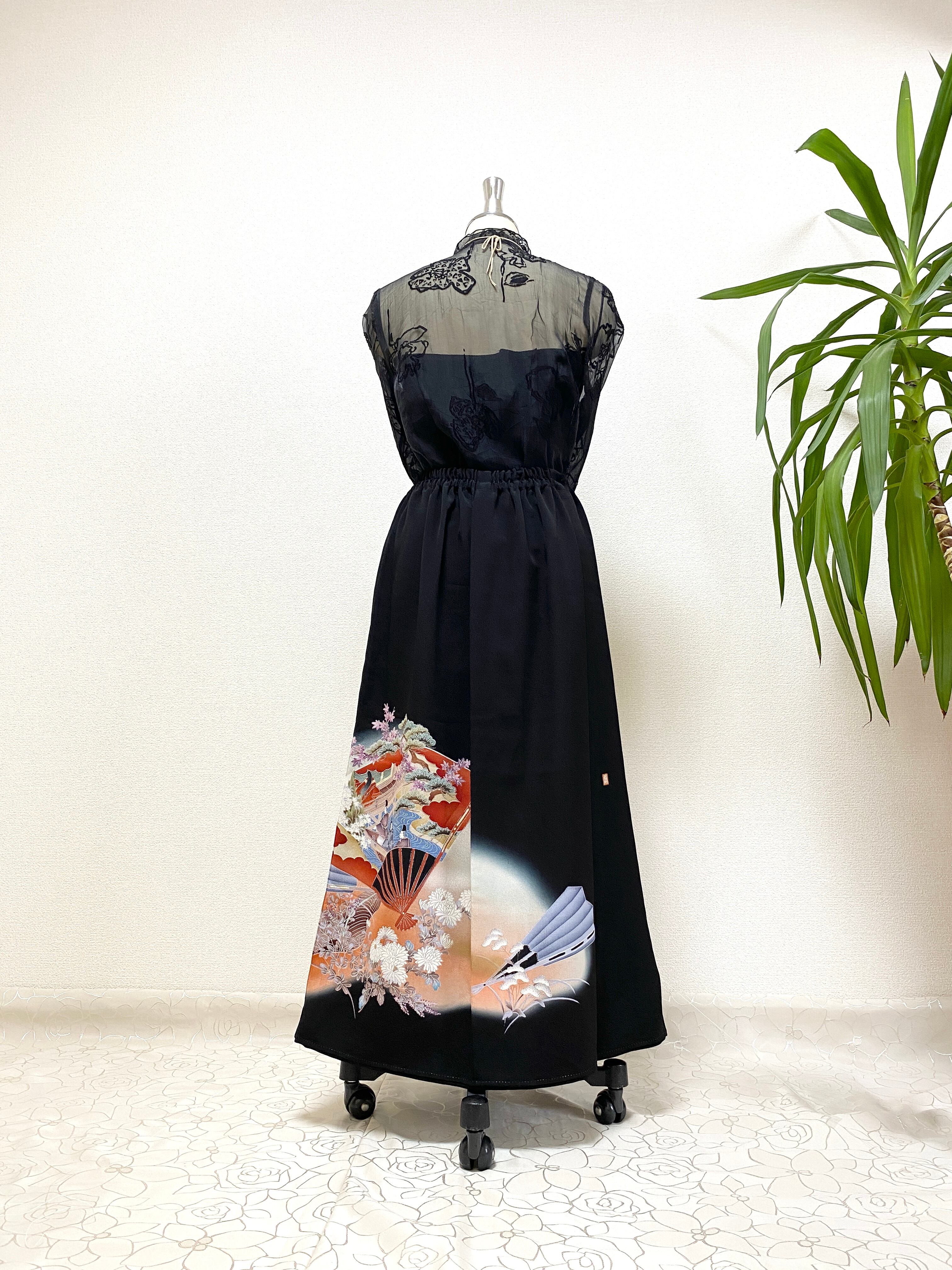 黒留袖着物リメイクウエストゴムロングスカートフリーサイズ