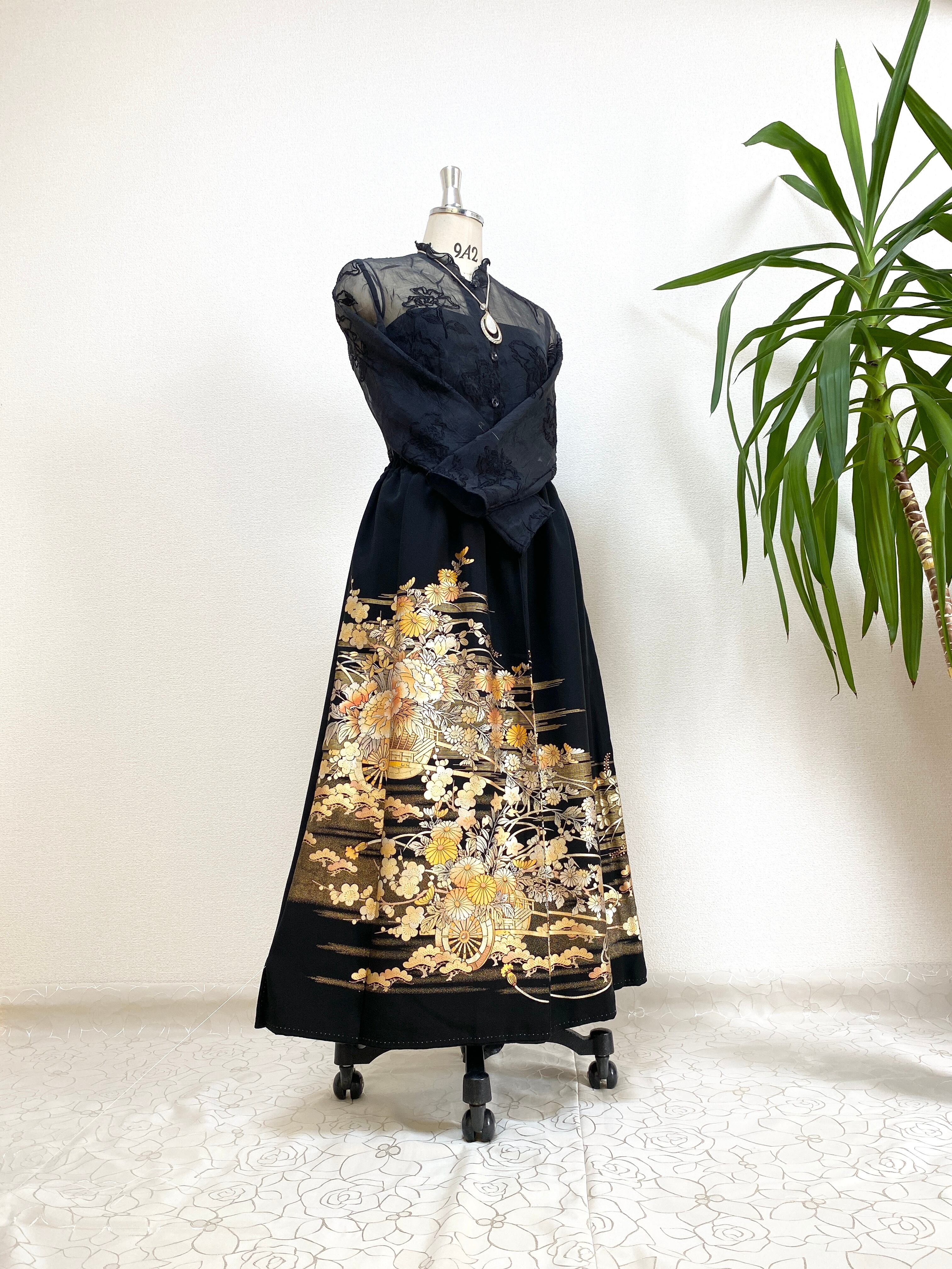 黒留袖着物をリメイクして作製したウエストゴムロングドレススカートフリーサイズです。