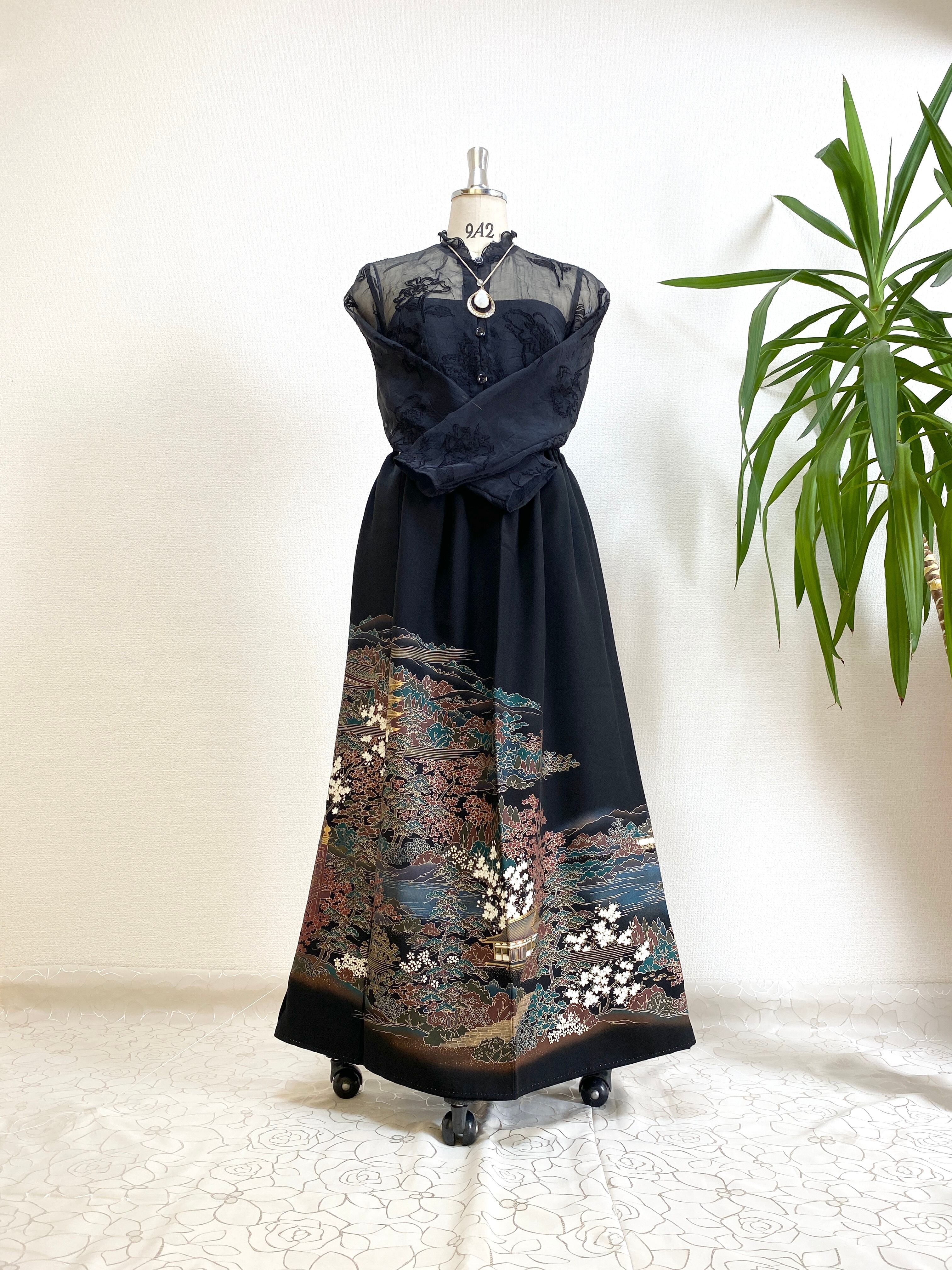 黒留袖着物をリメイクして作製したウエストゴムロングドレススカートフリーサイズ【超ロング丈】です。