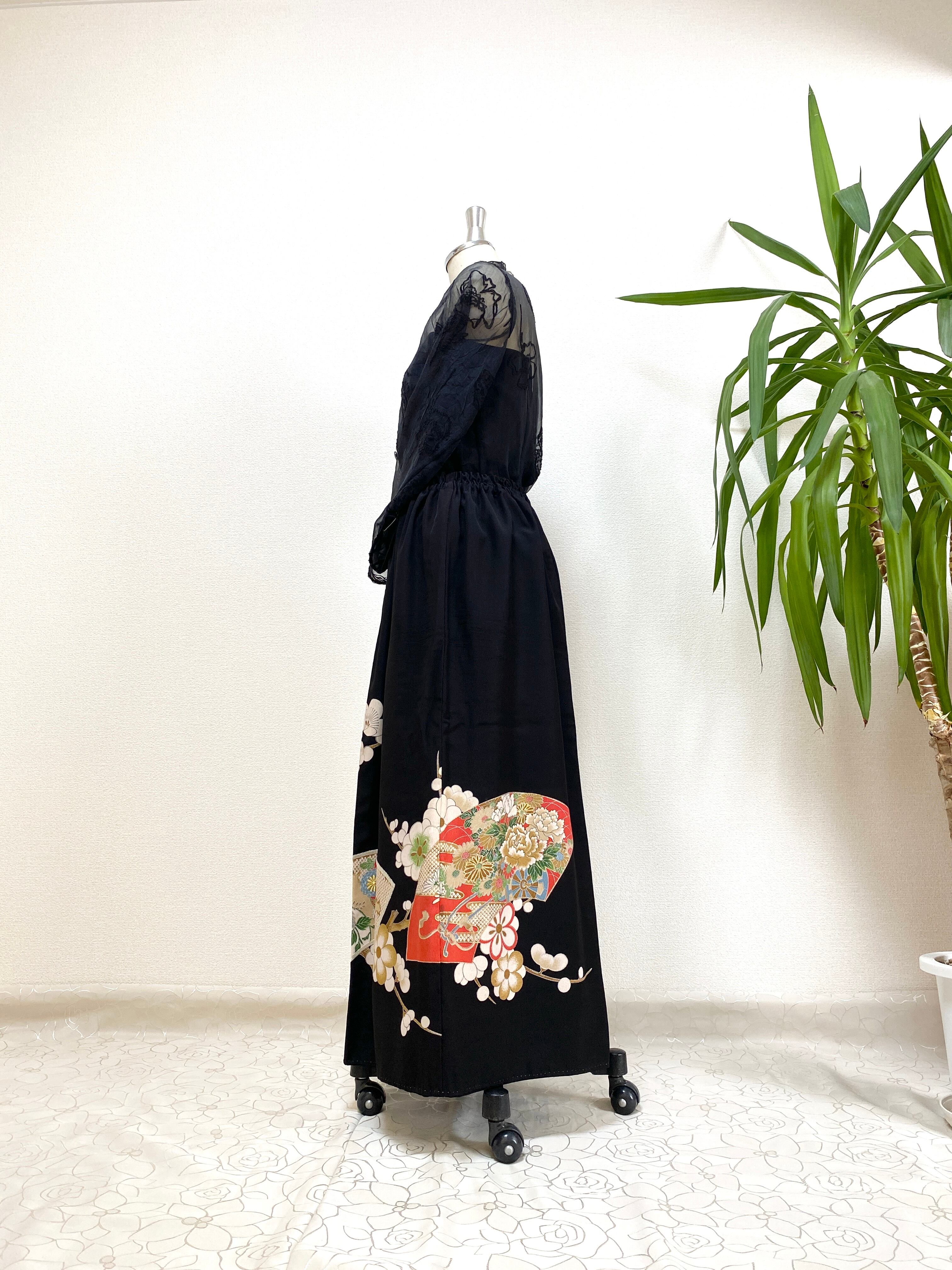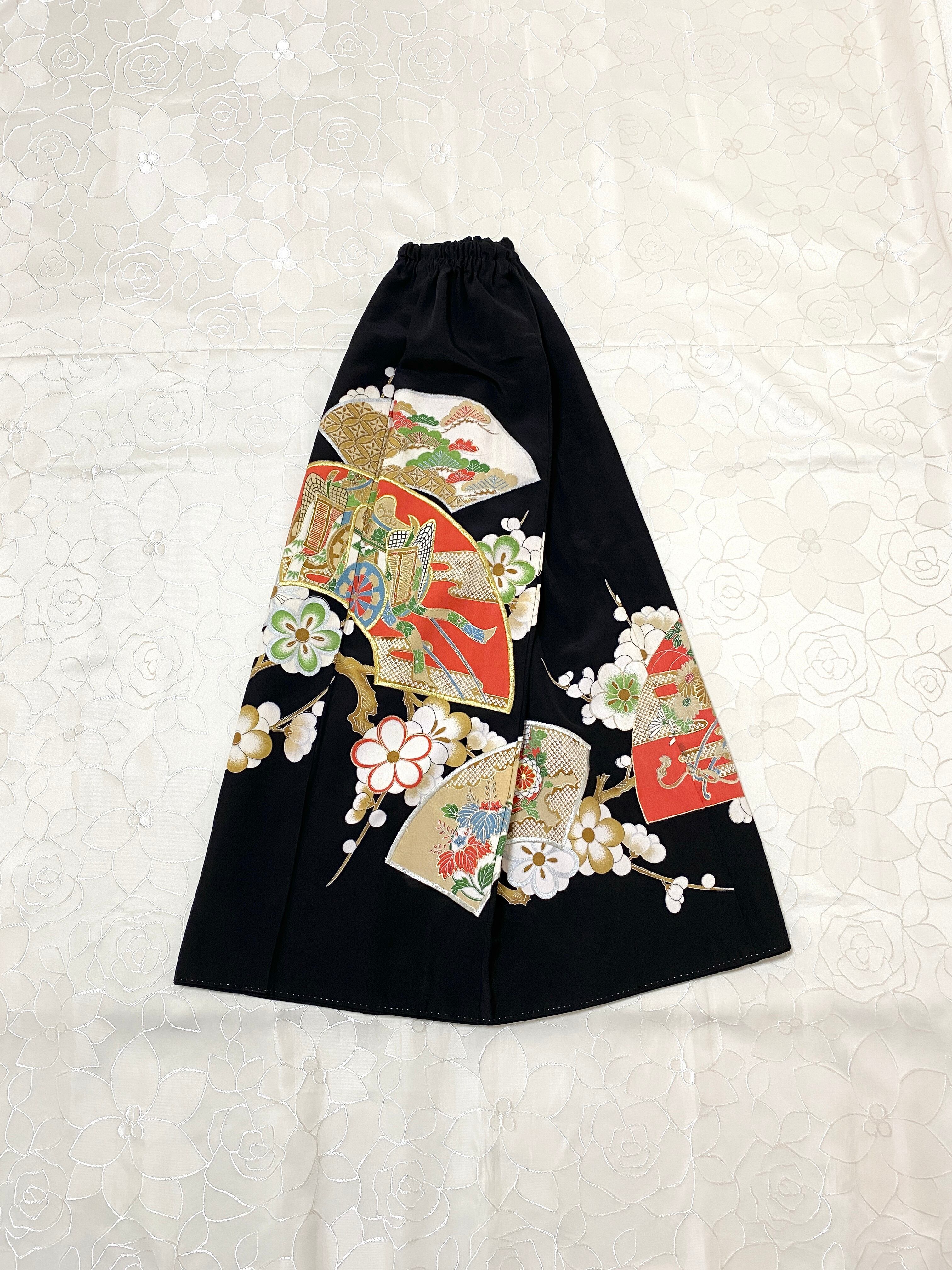黒留袖着物リメイクウエストゴムロングドレススカートフリーサイズ【超ロング丈】
