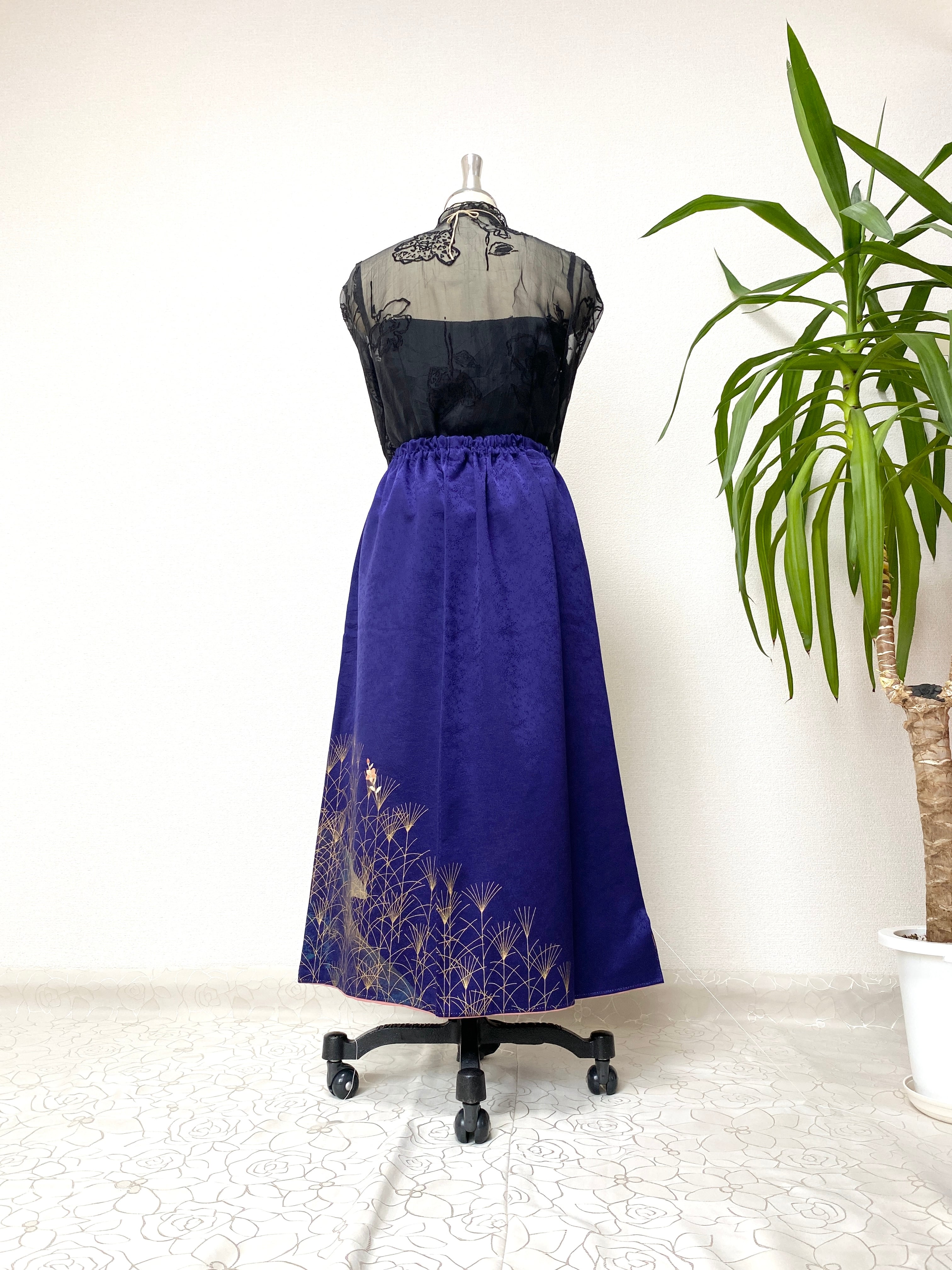 和装だけどスカート、ウエストゴムなので着るのがとてもラクチン体もとても楽な着物リメイクスカートです。