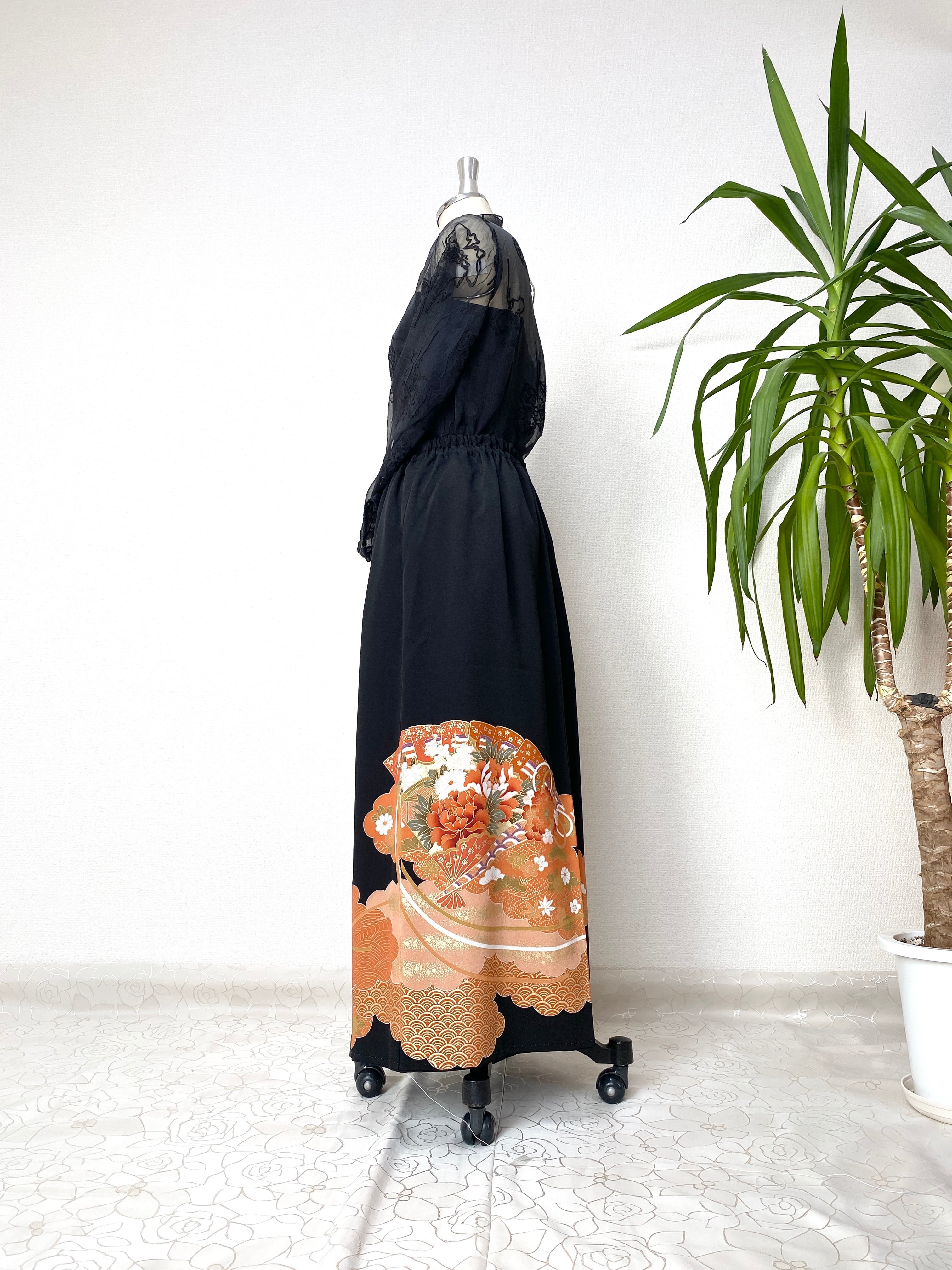 黒留袖着物リメイクウエストゴムロングスカートフリーサイズ