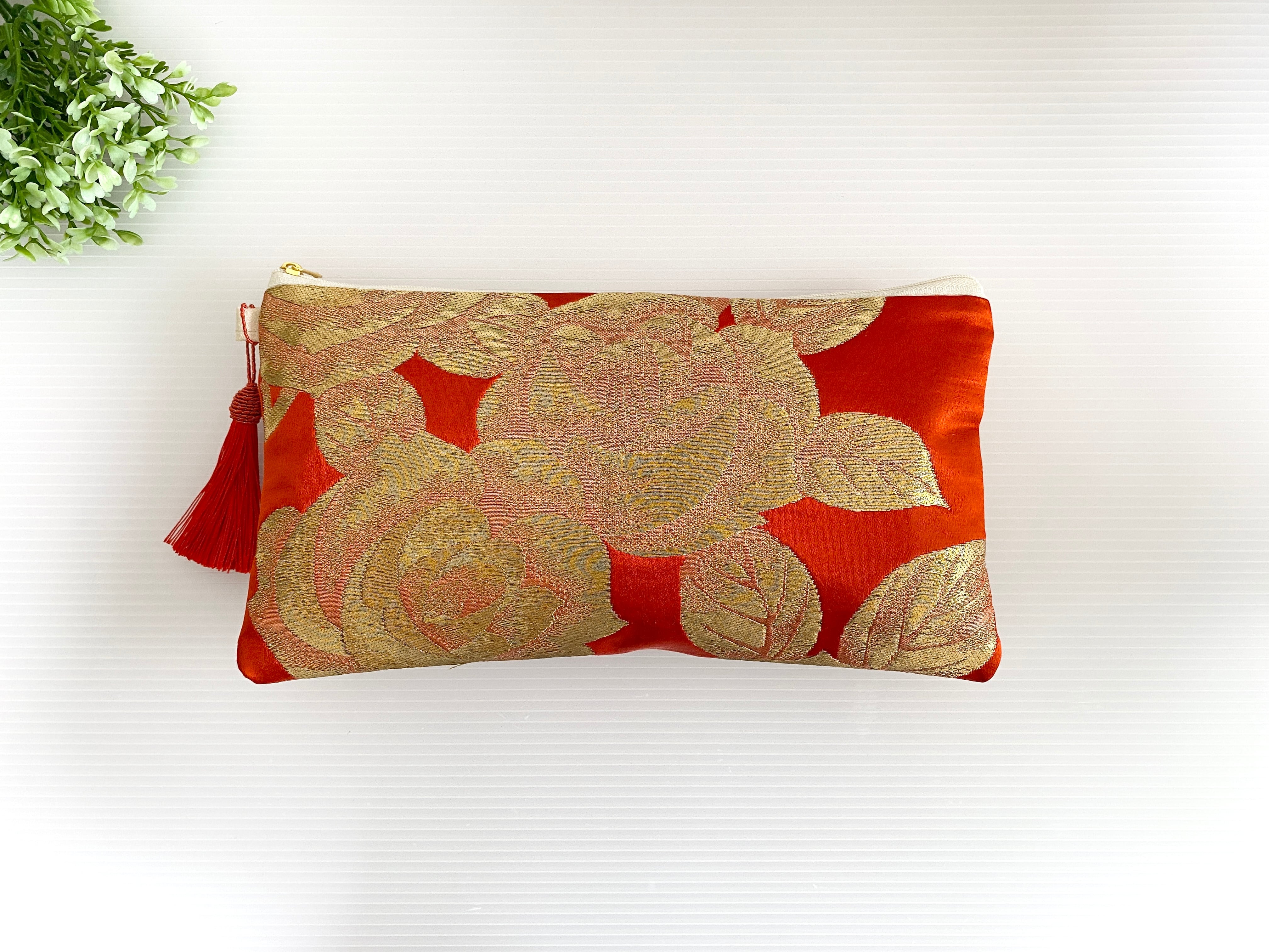 日本の古帯をリメイクして作製したポーチでハンドメイド品です。
