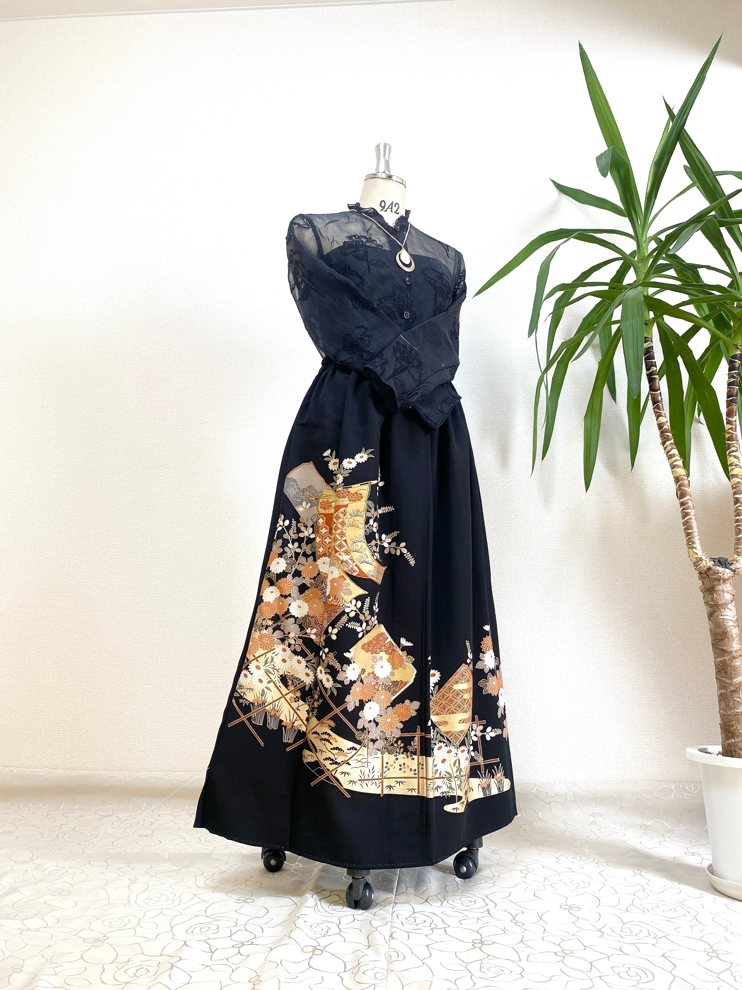 黒留袖着物リメイクウエストゴムロングドレススカートフリーサイズ【超ロング丈】