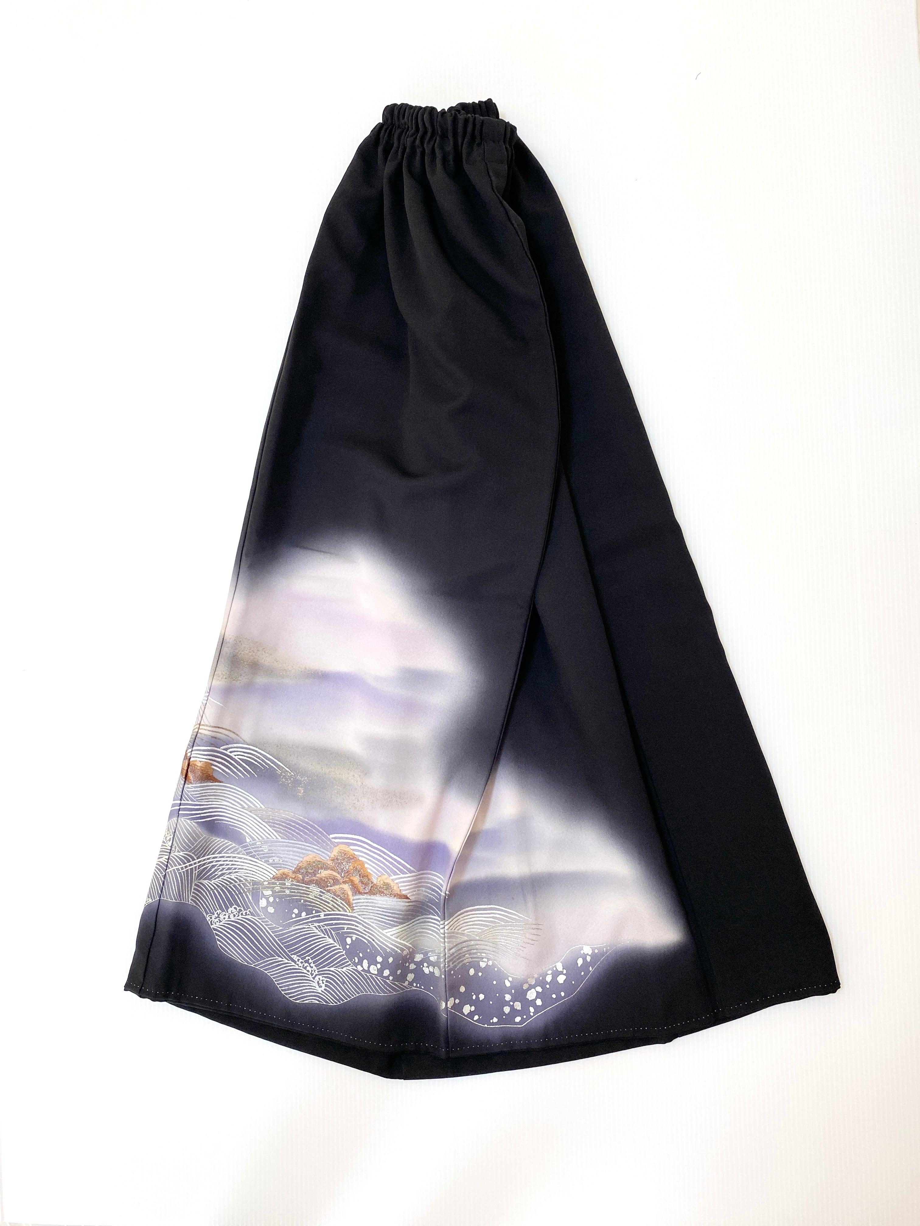 黒留袖着物をリメイクして作製したウエストゴムロングドレススカートフリーサイズ【超ロング丈】です。