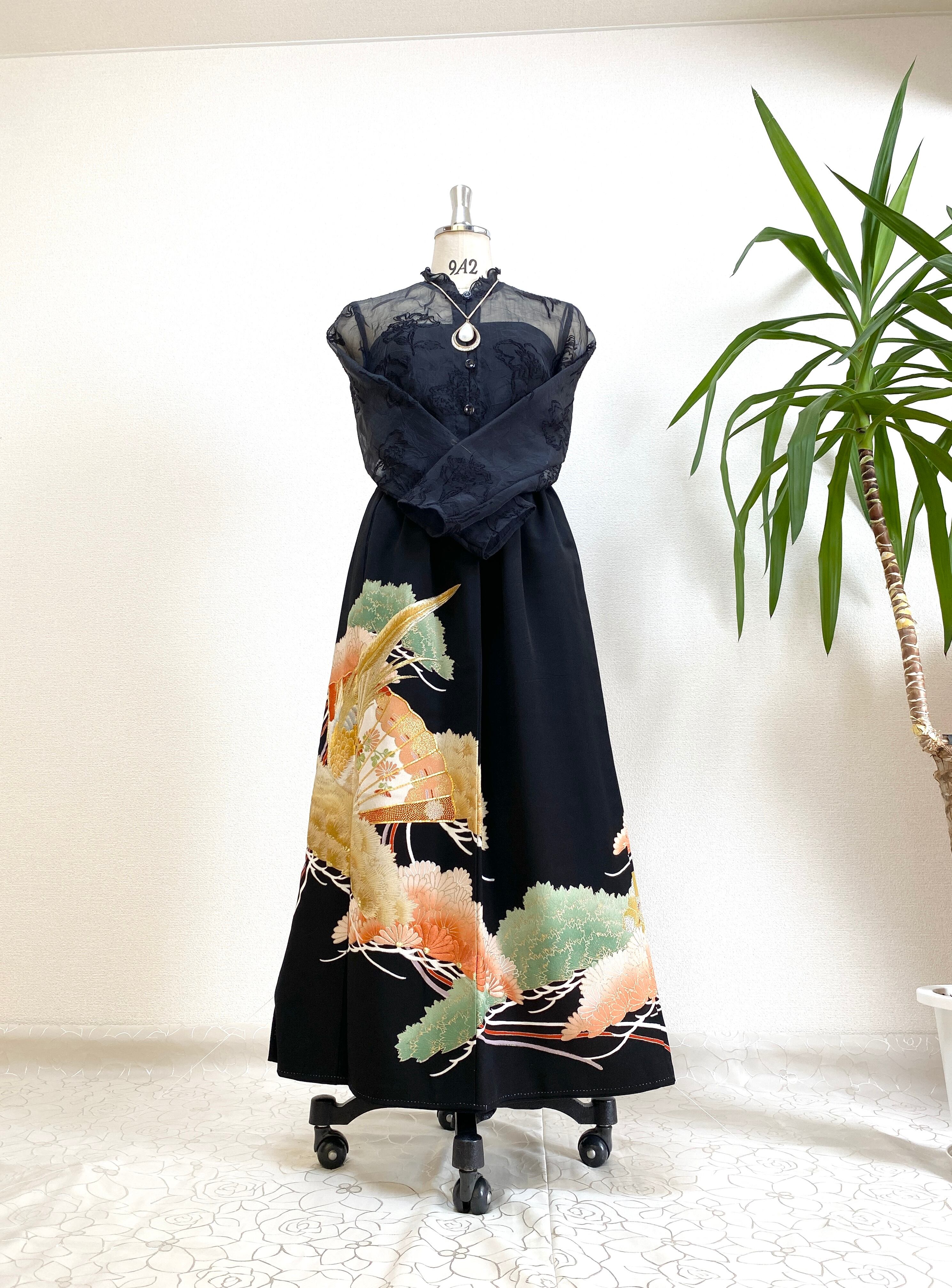 黒留袖着物リメイクウエストゴムロングスカートフリーサイズ