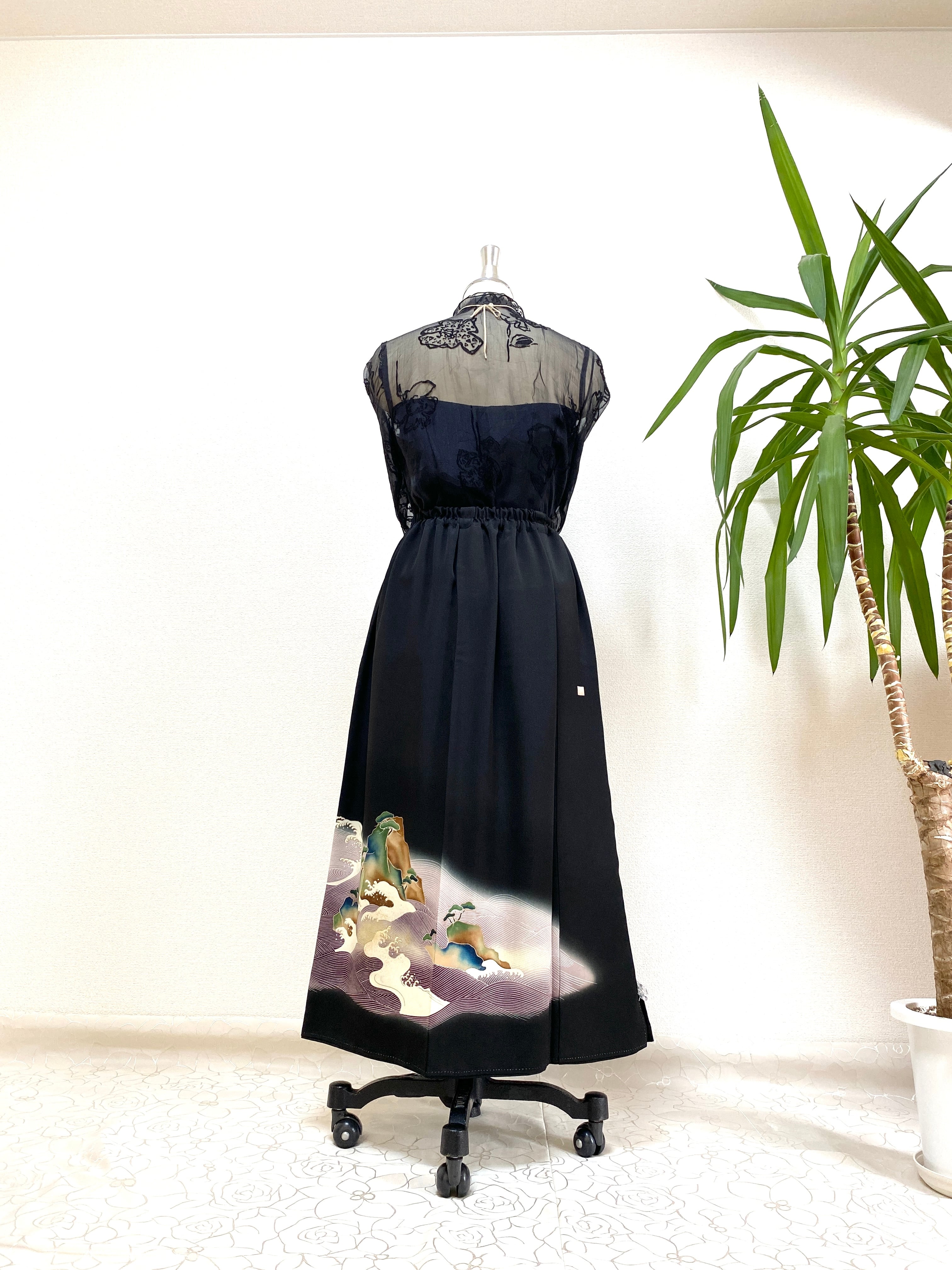 黒留袖着物リメイクウエストゴムロングスカートフリーサイズ