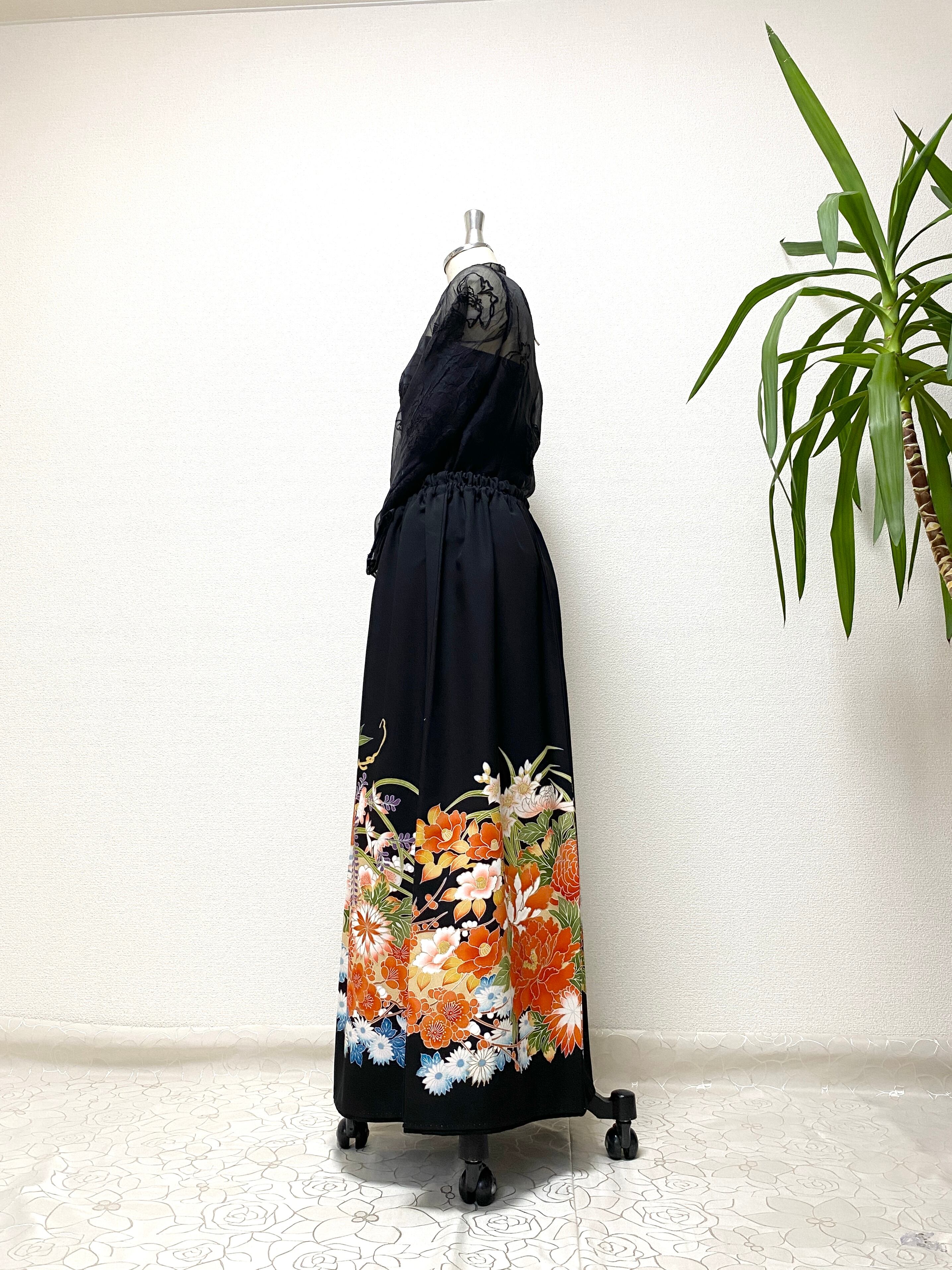 黒留袖着物リメイクウエストゴムロングスカートフリーサイズ【超ロング丈】
