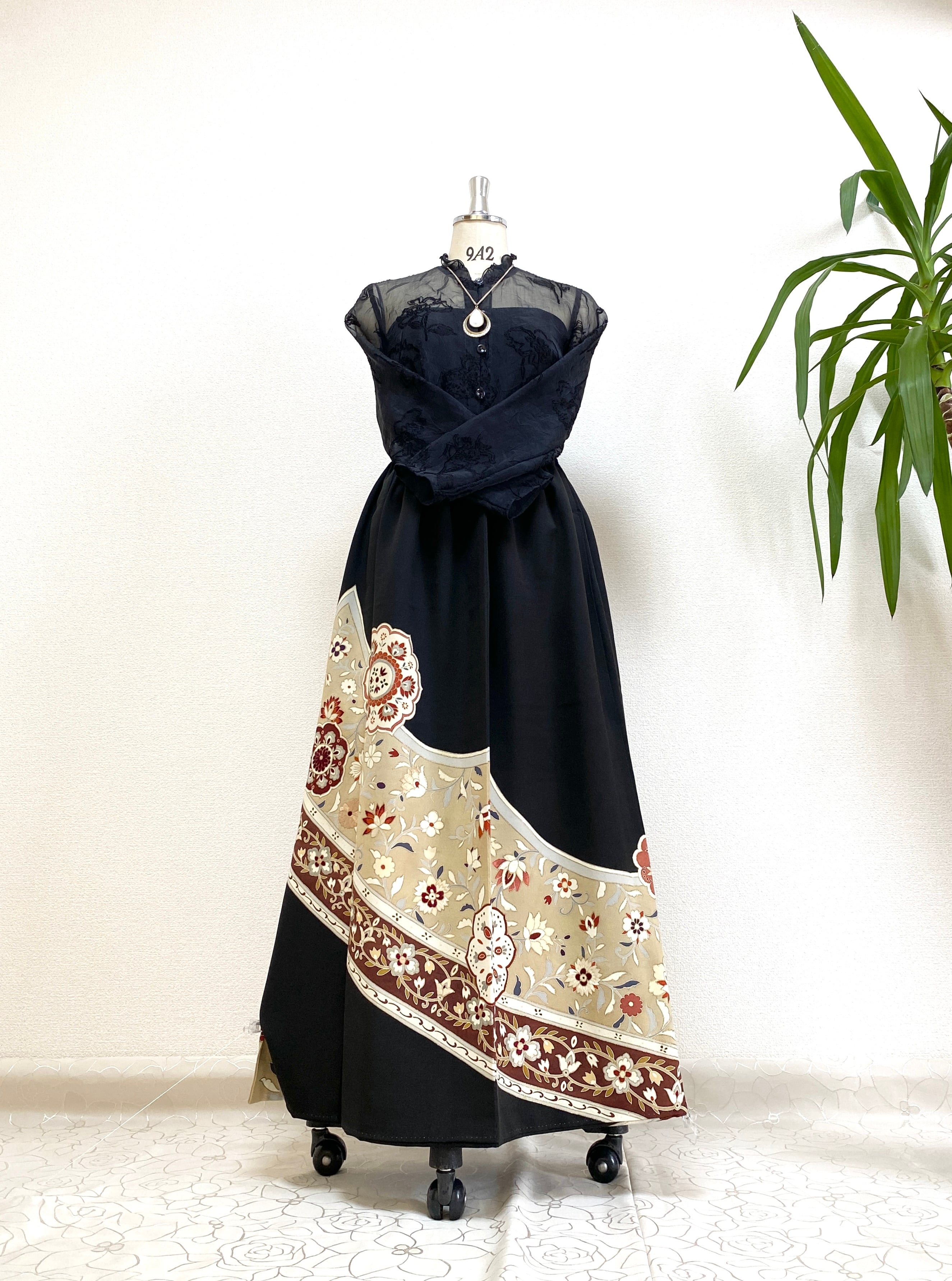 黒留袖着物をリメイクして作製したウエストゴムロングドレススカート【超ロング丈】フリーサイズです。