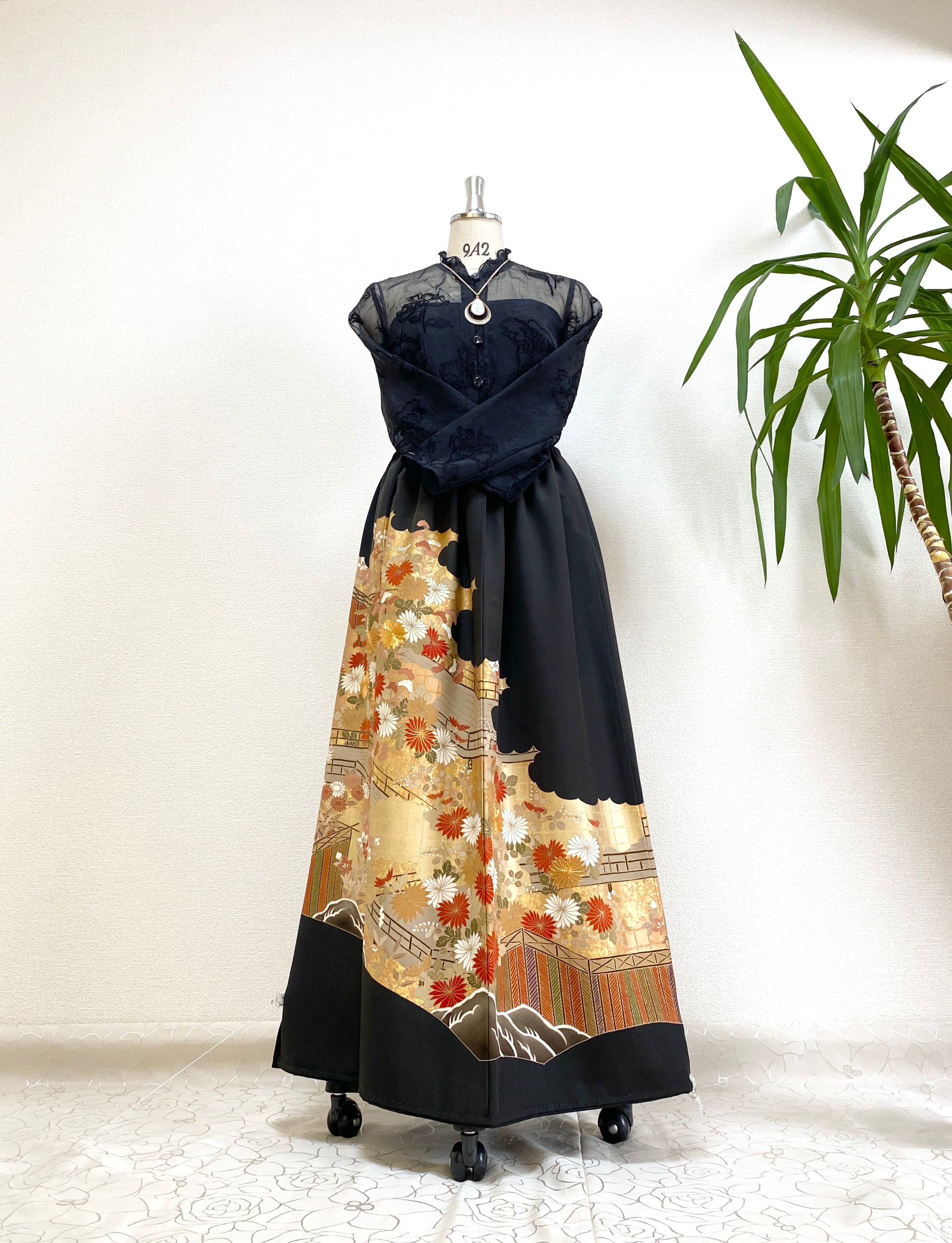 黒留袖着物をリメイクして作製したウエストゴムロングドレススカート【超ロング丈】フリーサイズです。