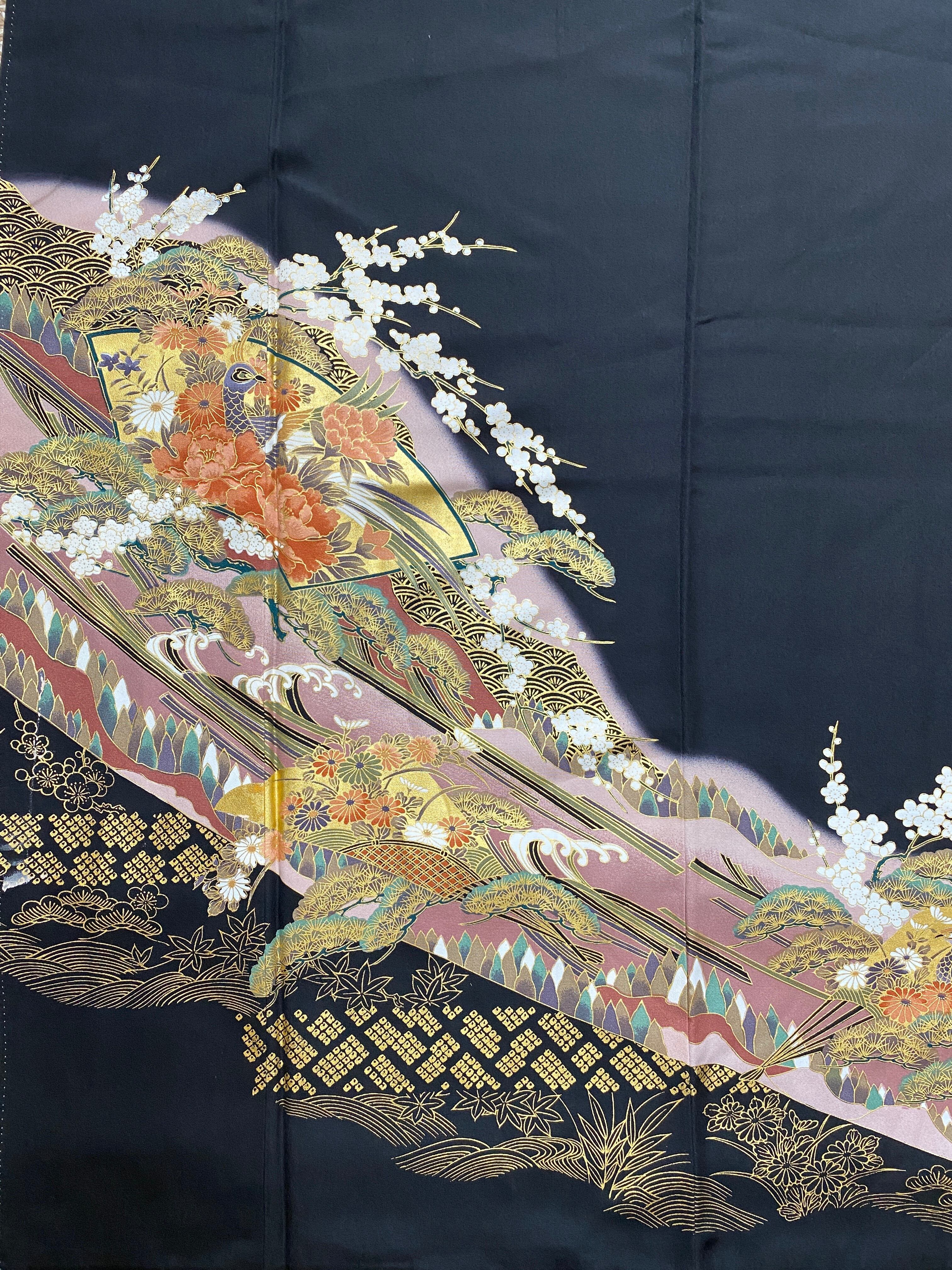 黒留袖着物リメイクウエストゴムロングスカート送料無料フリーサイズ1点物黒留袖着物リメイクロングスカートフリーサイズNO.1831